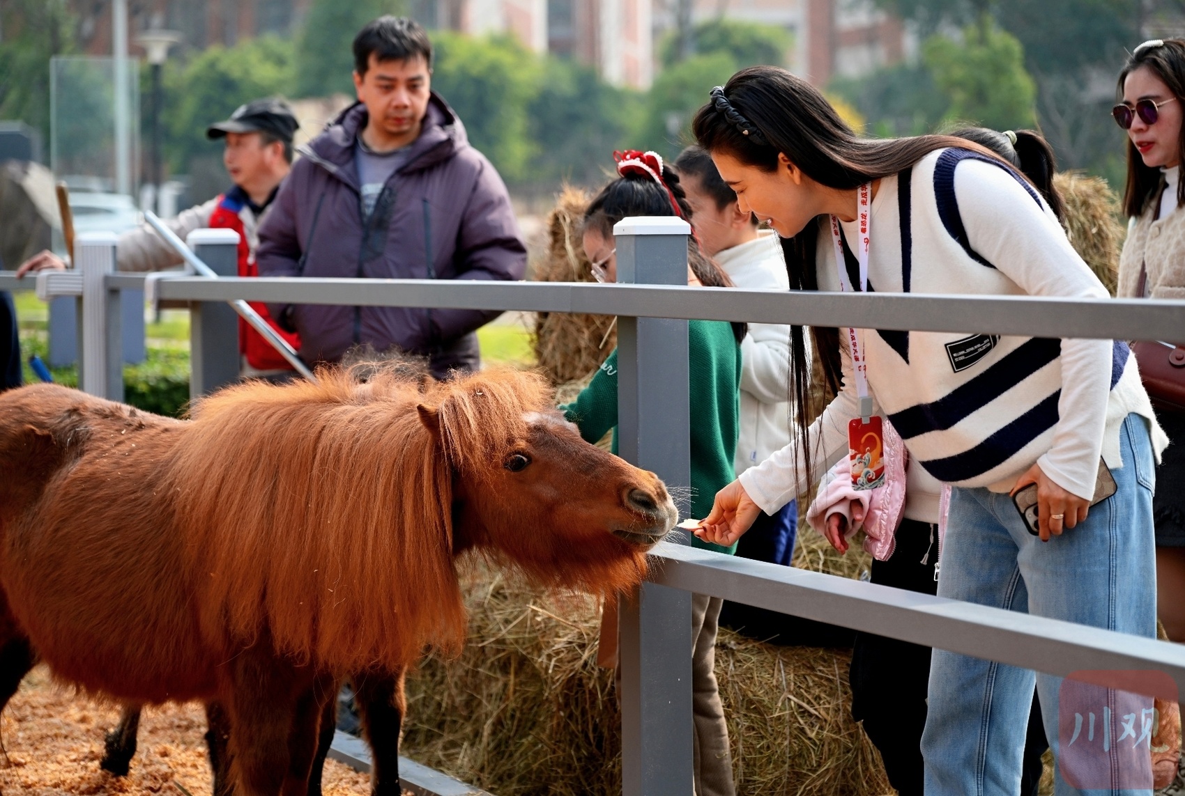 馆外,“蜀骥迎春,开局鞍好”马术运动展热闹非凡。3米高奔马光影装置流光溢彩,专业马术展示区内,温血马、纯血马等名马轮番亮相,英姿飒爽;互动区里,温顺的英国舍特兰矮马备受小朋友喜爱,投喂、合影笑声不断。“骉骉舞”欢快起舞,卖货郎趣味猜谜、文创花车琳琅满目,沉浸式年俗体验让现场年味拉满。