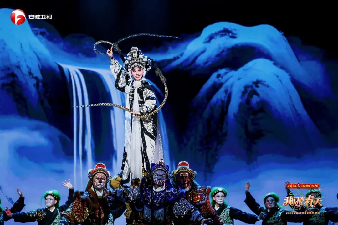晚会以“百戏入皖”戏曲串烧《入戏》,谱写了当代梨园的华彩乐章。从浙江婺剧《三打白骨精》的破圈绝技燃爆开场,到国家京剧院《赤桑镇》、河南豫剧《逛花灯》的经典呈现,最终回归安徽黄梅戏的婉转乡音,并由著名黄梅戏表演艺术家韩再芬压轴唱响《乡音本是黄梅调》。这不仅是“徽班进京”的当代回响,更在舞台方寸间,展现了中华戏曲海纳百川的艺术气度与历久弥新的时代格局。