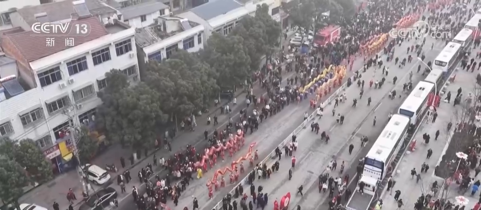在黄冈市红安县民主街,一条有着16支队伍、500人规模的“巨龙”正式开启了巡游的步伐。龙头的摆动,龙身的缠绕,每一个动作都透着老把式的功底。当传承了三百多年的龙灯,舞进红安影视幻城的青砖黛瓦之间,古城里的古风场景瞬间成了非遗最生动的展台。现场,游客可以和舞龙队员们零距离互动,可以说是年味十足,热气腾腾。