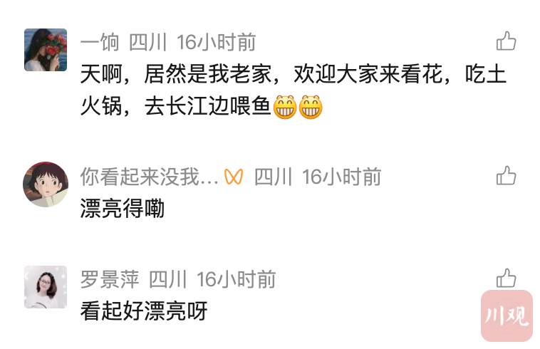 2月14日,全网粉丝超500万的文旅大号“成都周边游”发布推文,邀请游客过年前往高县赏花。文中那片抢先全国大部分地区盛放的万亩金色花海,瞬间点燃了人们对于2026年第一抹春色的向往。评论区很快变成了一场“家乡推荐会”:“好漂亮!”“欢迎大家来我老家看花,吃火锅!”