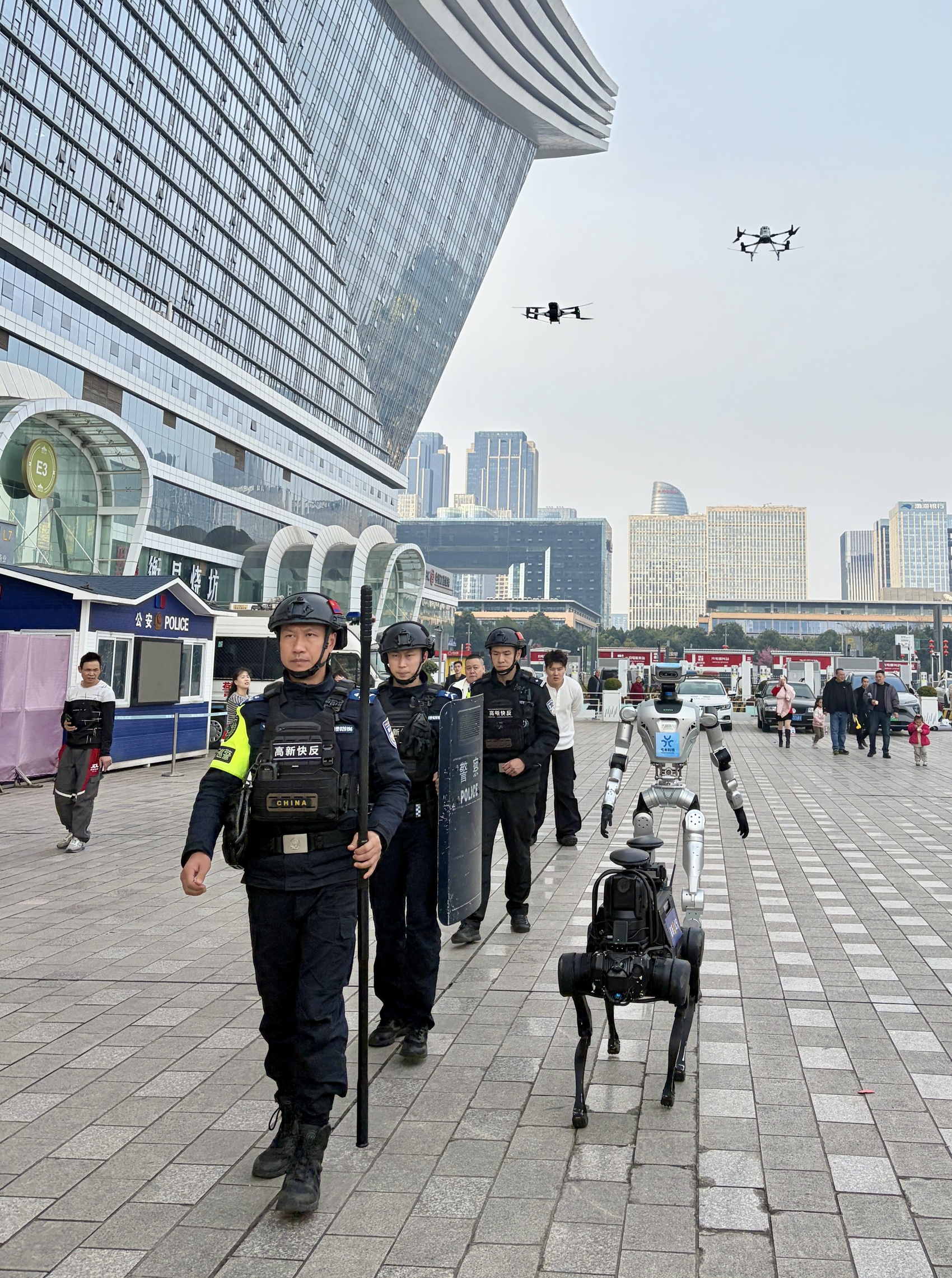 全尺寸人形机器人迈着稳健步伐巡逻、机械狗灵活穿梭于人群排查隐患、警用无人机悬停空中实时巡航……