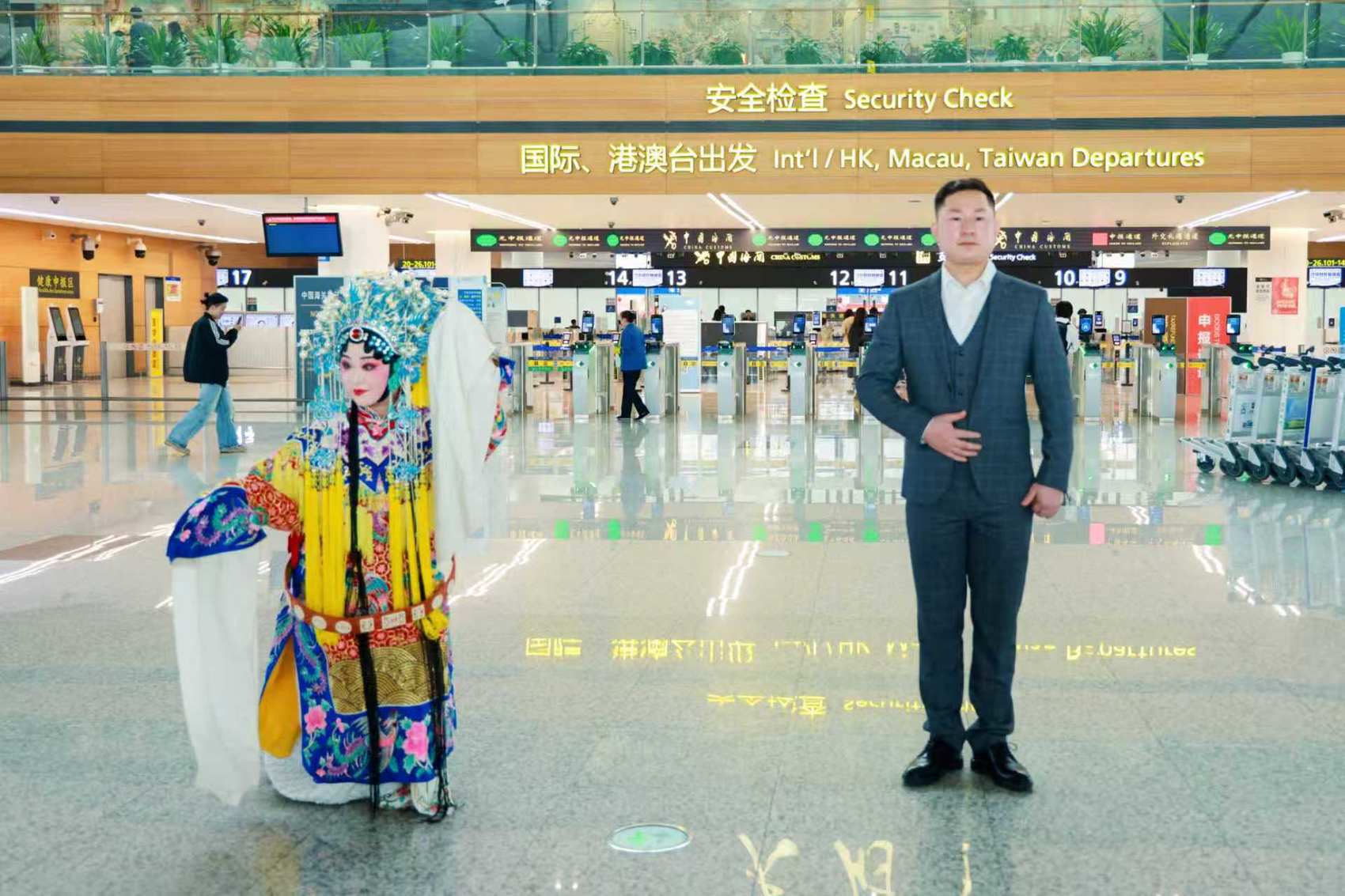 来自新加坡的陈先生携家人首次来到成都,刚走出航站楼就被川剧变脸吸引。“这是我第一次现场看川剧,太有魅力了。”他用不太流利的中文继续说,“机场氛围很温暖,我们对成都之行充满期待。”