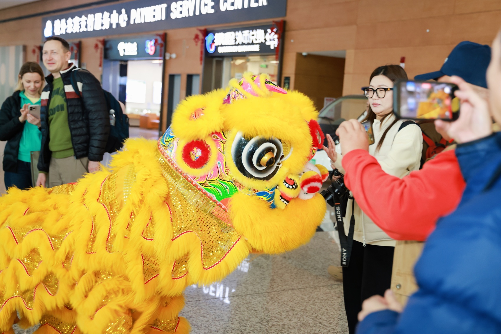 “咚咚锵!”T1航站楼到达大厅里,成都东部新区余门拳队伍带来的《舞狮贺岁》率先点燃现场气氛。红绸狮身伴着锣鼓节奏腾挪跳跃,灵动的狮子时而向旅客拱手作揖,时而送上新春祝福,不少旅客拿出手机定格这热闹瞬间。