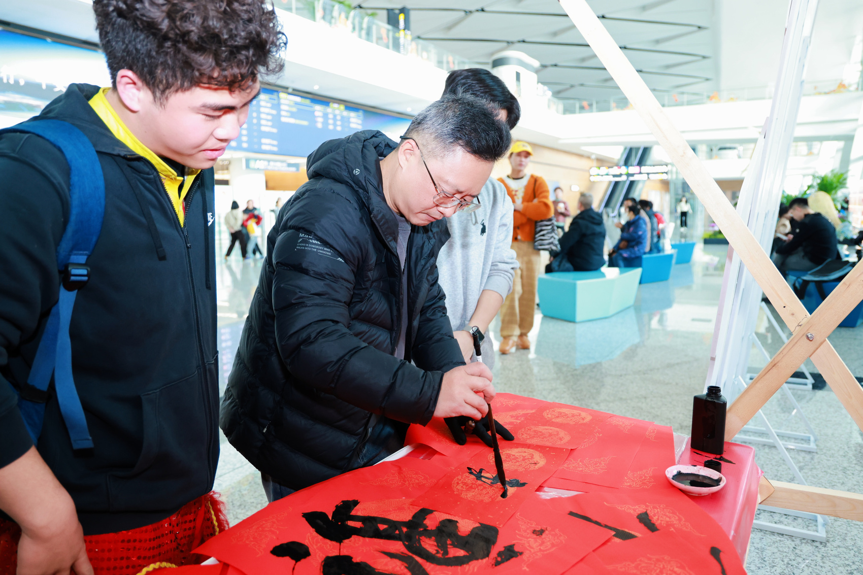 同步进行的互动活动也吸引不少人参与。在非遗体验区,书法家们挥毫泼墨,将“马到成功”“阖家幸福”等美好期许凝于笔端,一张张红彤彤的创意春联,被旅客们争相领走。年画、糖画等摊位前更是排起长队,旅客们亲手印制年画,感受传统技艺的魅力。