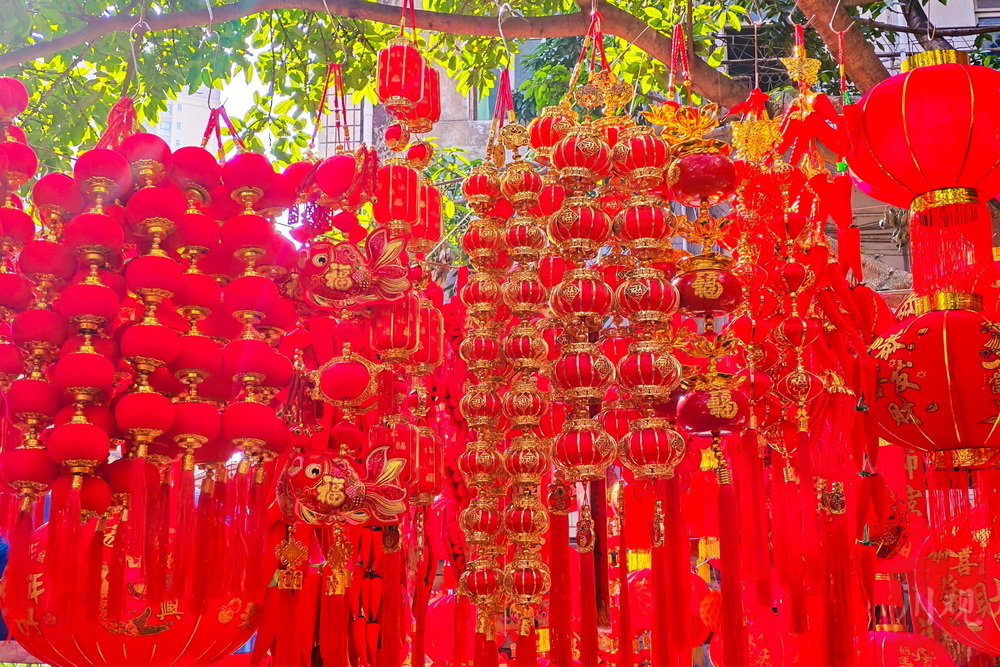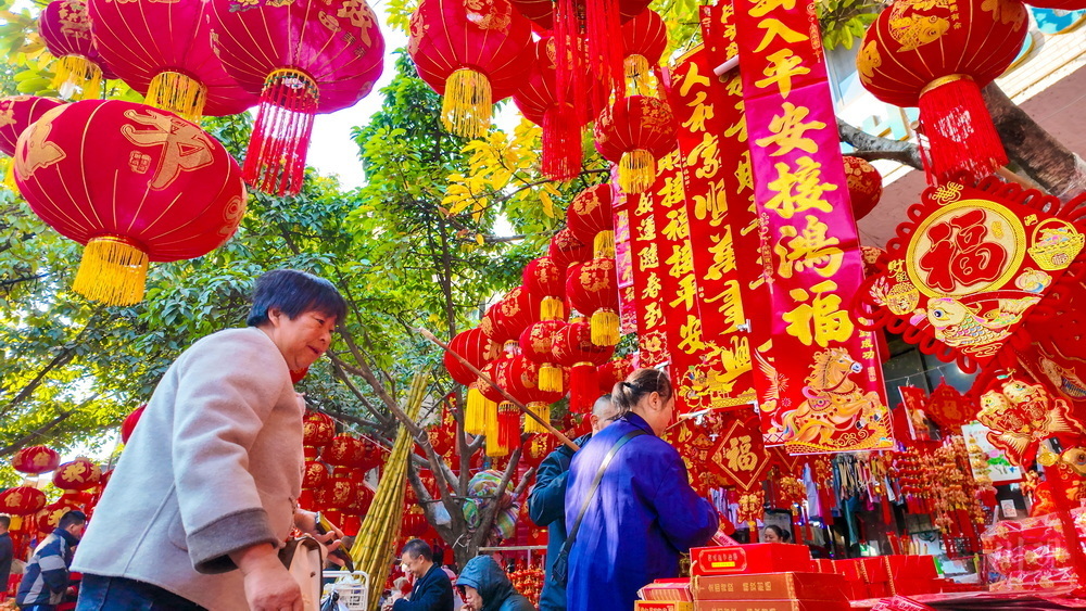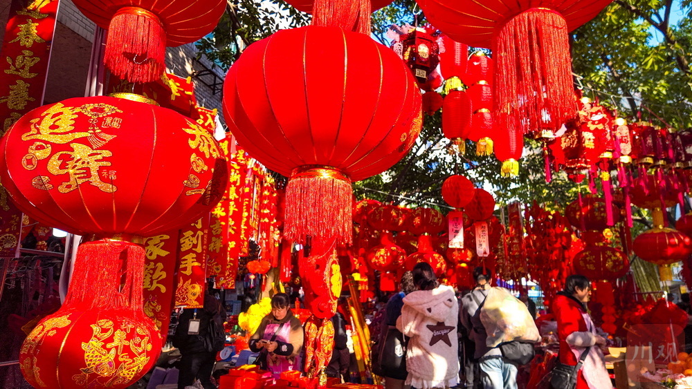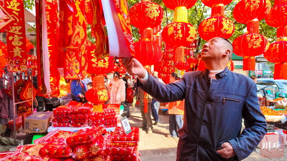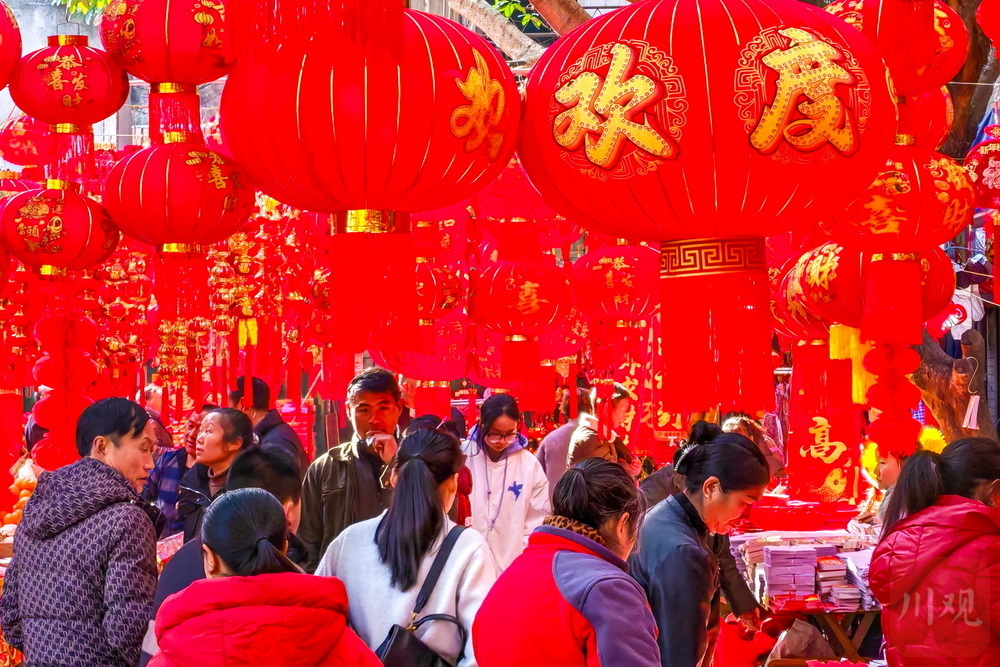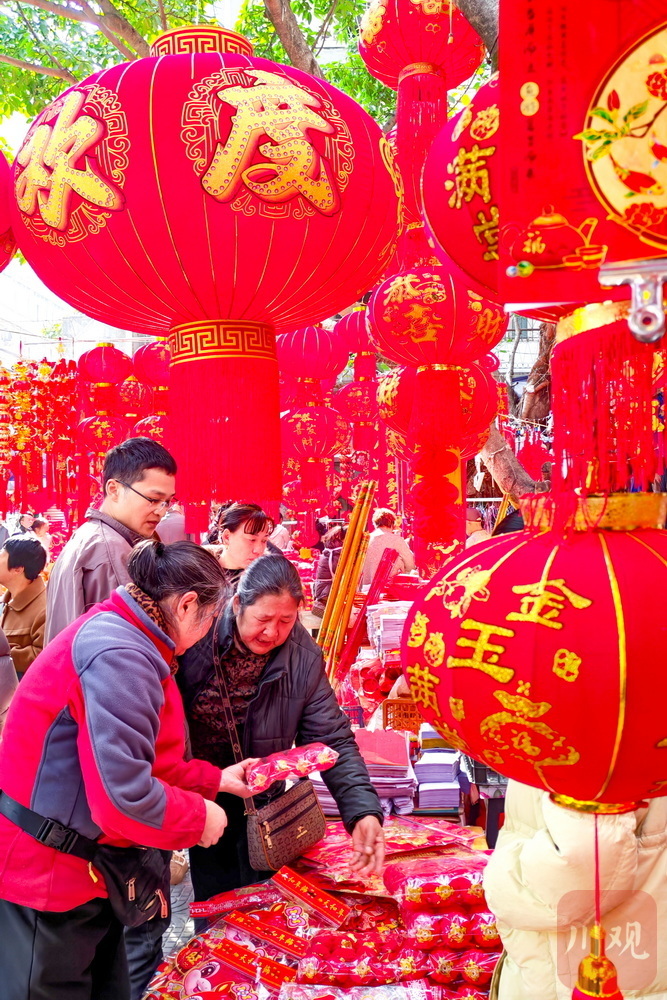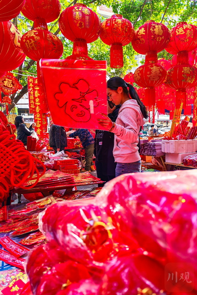红红的灯笼、喜庆的春联、栩栩如生的年画……过年就要红红火火!2月15日,位于雅安石棉县短途客运车站旁的杂货市场被喜庆的大红色“攻陷”。随着马年春节的临近,灯笼、春联、年画等年货铺满货架,市民纷纷采买年货,年味浓浓。