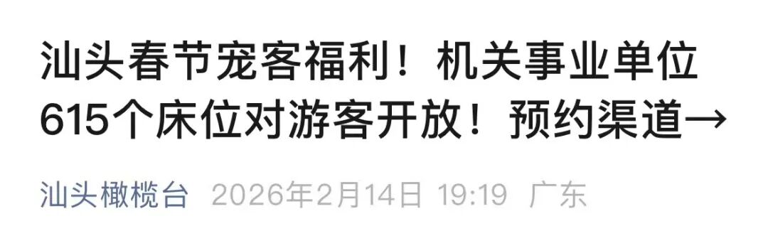 今年春节假期,汕头旅游市场持续火爆。为缓解春节旅游住宿难题,汕头统筹协调部分机关事业单位接待设施对外开放,首批放出479个房间(615个床位),涵盖党校培训用房、人才适用房,让来汕游客住得安心、住得实惠。