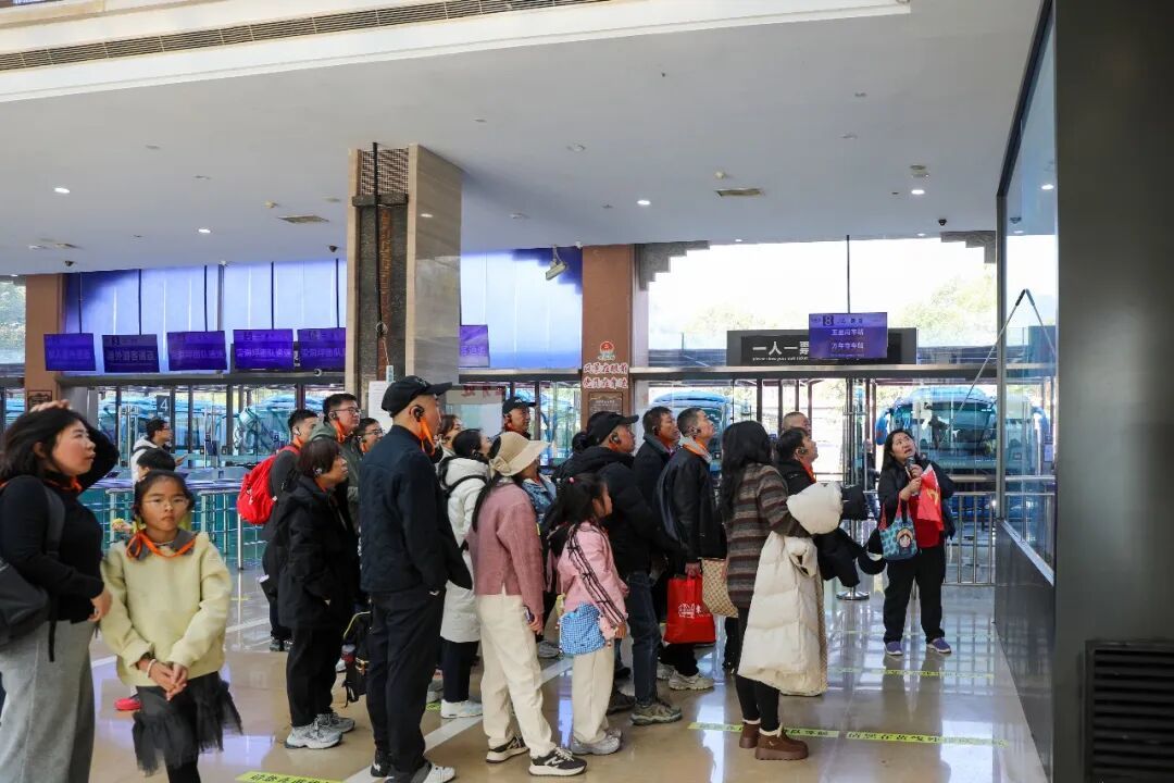 上午十点,峨眉山景区黄湾游客中心车流络绎不绝,游客驻足拍照“打卡”,排队购票候车,秩序井然。