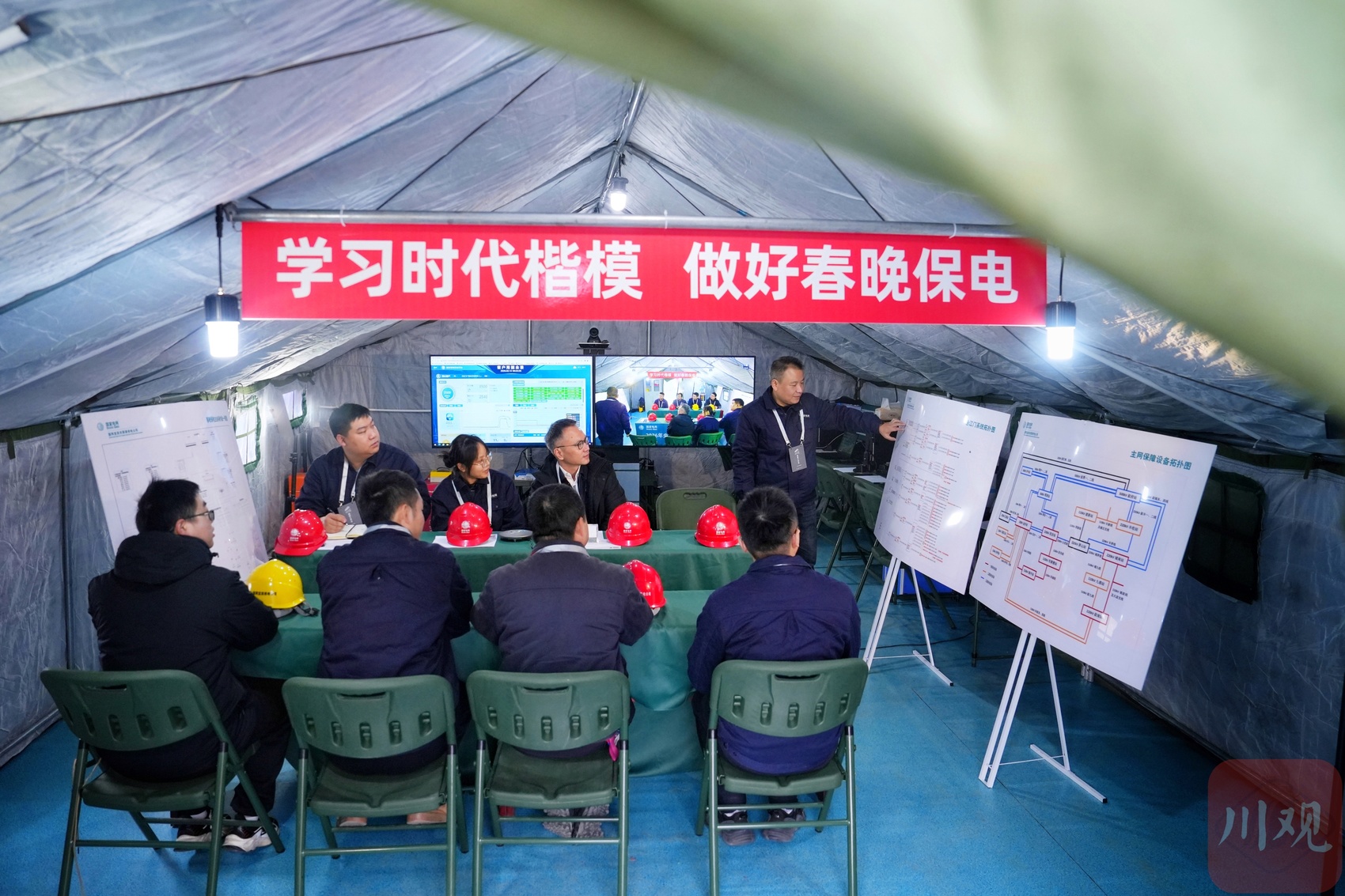 现场指挥部组织各点位负责人集中研讨,复盘保电方案、熟悉关键环节。(倪昶摄)
