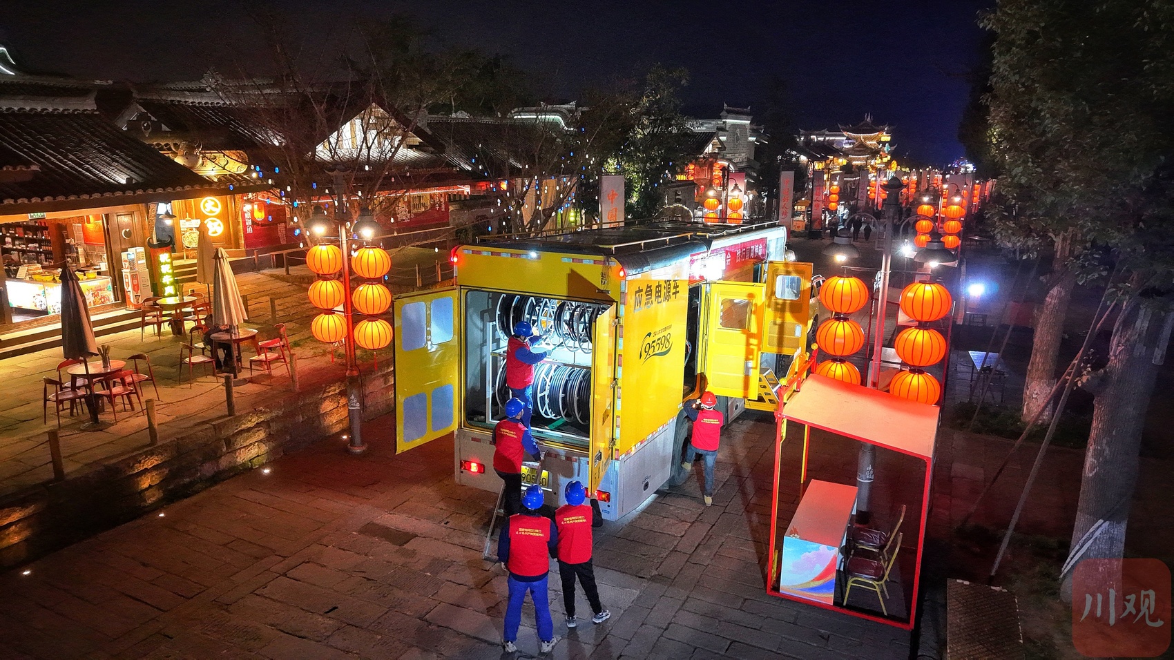 共产党员服务队在李庄古镇接入发电车,为央视春晚李庄拍节目摄录制提供可靠备用电源保障。倪昶摄