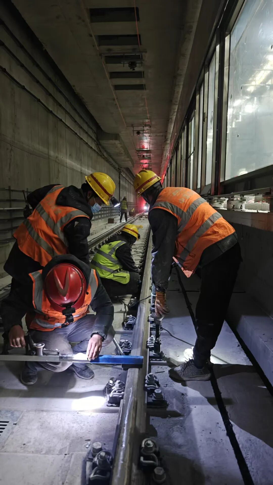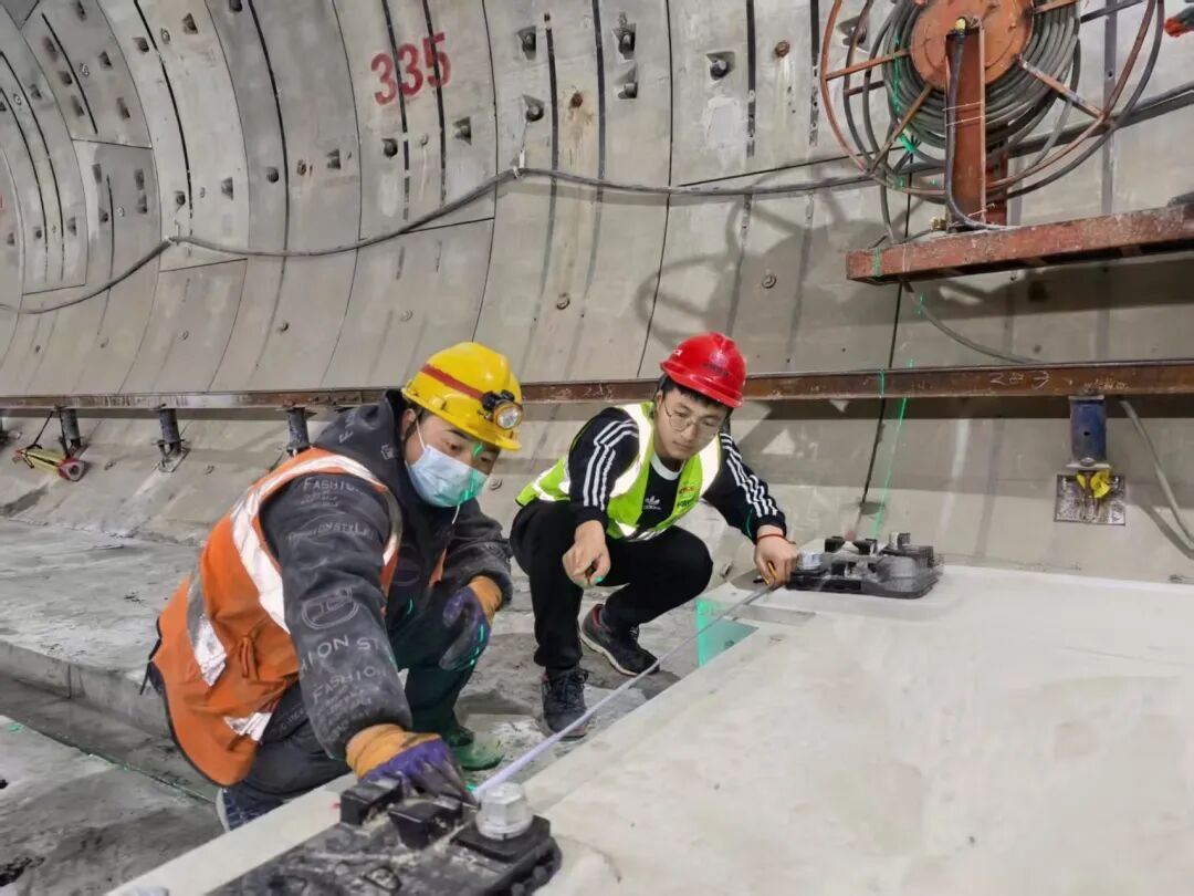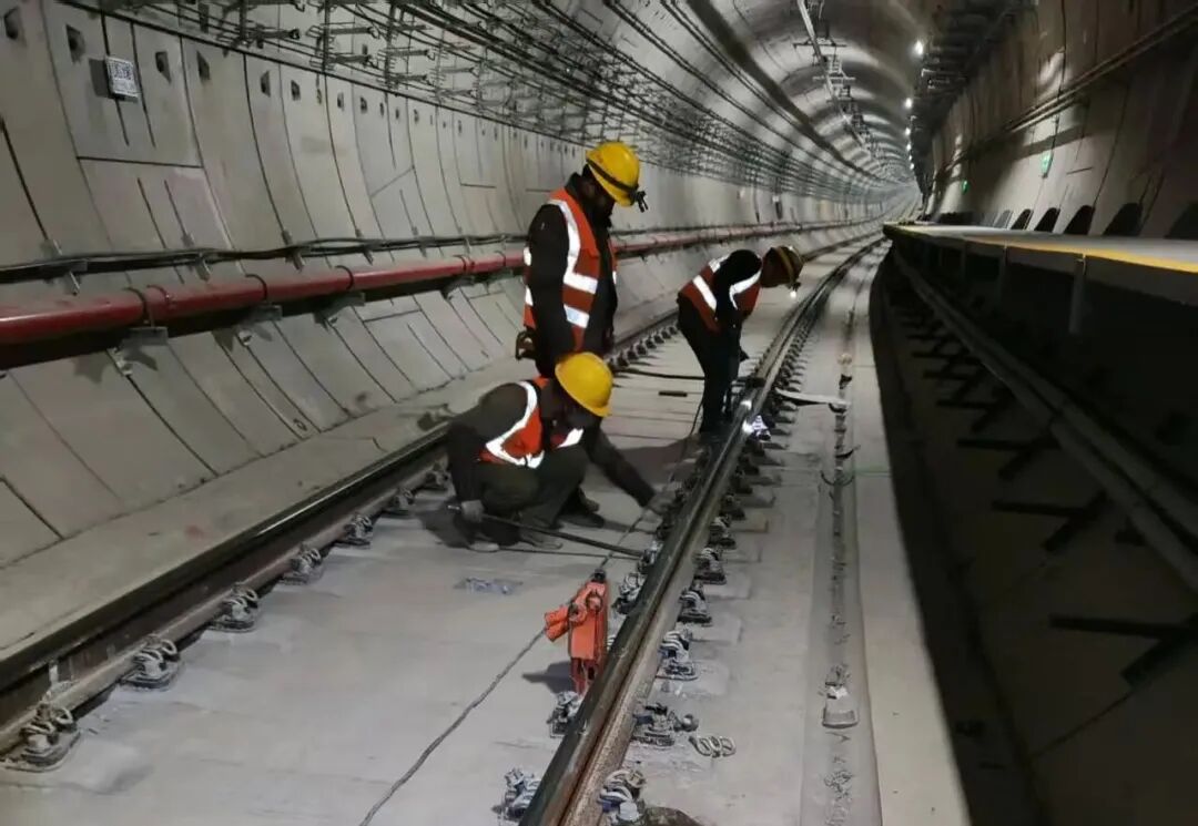 为高效推进铺轨工程,建设团队创新采用“轨排法”作业模式,依托机械化与智能化铺轨设备,实现轨排拼装、运输就位、轨道调整、道床浇筑等环节无缝衔接,每日长轨排铺设效率较传统工艺提升20%,大幅加快施工进度。在保障施工效率的同时,建设者对工程质量精益求精,专业测量人员运用轨道几何状态测量系统(轨检车),对轨面实时高程、轨道方向、轨距等关键参数进行实时监测、精准把控,始终坚守“毫米级”施工标准,切实保障轨道铺设质量符合规范要求,为线路后续实现全自动驾驶运营筑牢品质根基。