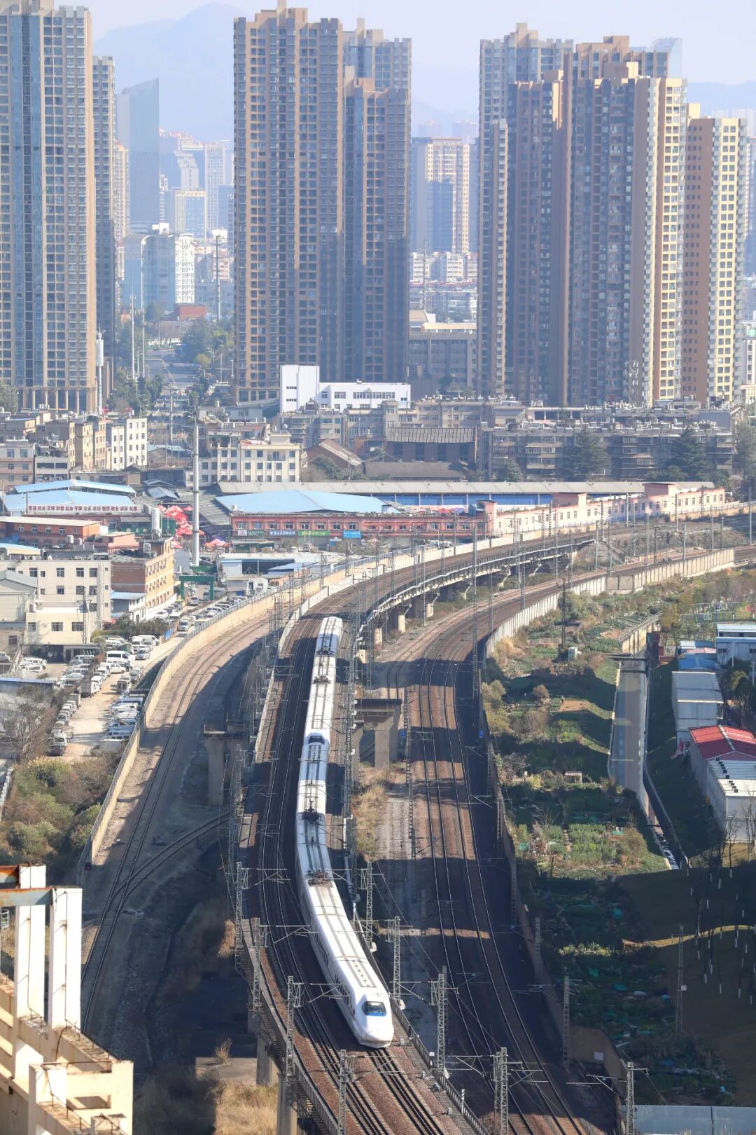 △2月15日,动车组列车行驶在云南昆明城区。新华社发(郑益 摄)