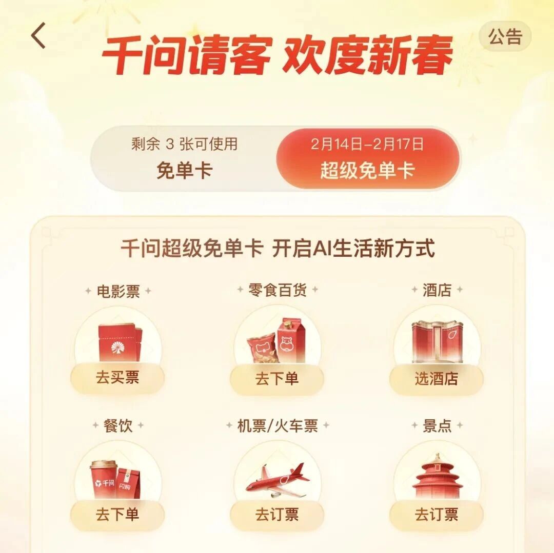 2月14日下午3点至2月17日,千问官宣“春节大免单”再加3天,每人可领10张25元超级免单卡。除了点餐饮、囤年货,超级免单卡还能用来买电影票、门票、订酒店和机票,而且有效期到4月30日。