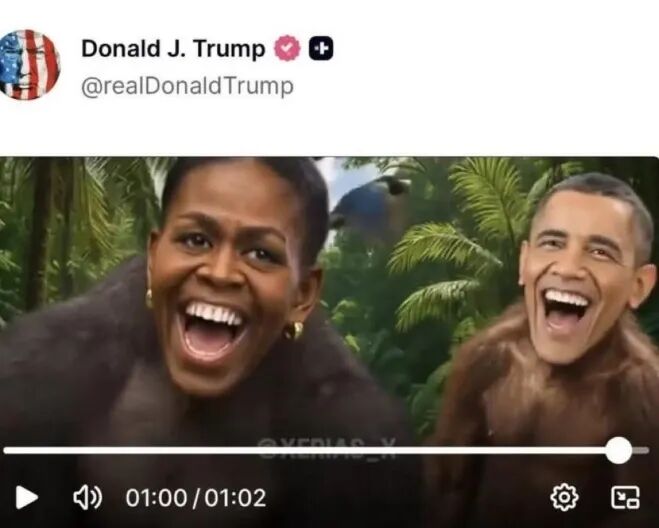 据新华社消息,在特朗普“真实社交”账号5日晚发布的一段视频中,结尾处出现两个灵长类动物的画面,脸部被替换为奥巴马及其夫人米歇尔的笑脸。这段涉嫌种族主义的视频引发美国政坛震怒,数名资深共和党籍参议员呼吁删除视频片段,民主党方面更是强烈谴责。白宫直至6日才删除相关视频,此时距发布已过去逾10小时。白宫解释称,上述贴文由一名工作人员“误发”。