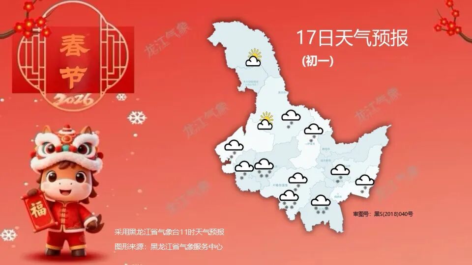 16日(除夕):大兴安岭、黑河北部、齐齐哈尔南部、大庆、绥化南部多云有阵雪,其它地区晴有时多云。