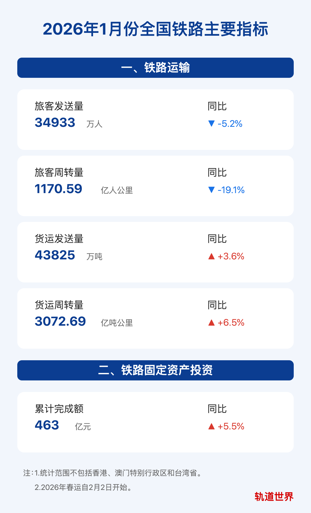 2026年1月份,全国铁路运输生产总体保持平稳运行。旅客发送量完成34933万人,比上年同期下降5.2%,旅客周转量完成1170.59亿人公里,下降19.1%。货运方面呈现增长态势,货运总发送量完成43825万吨,同比增长3.6%,货运总周转量完成3072.69亿吨公里,增长6.5%。