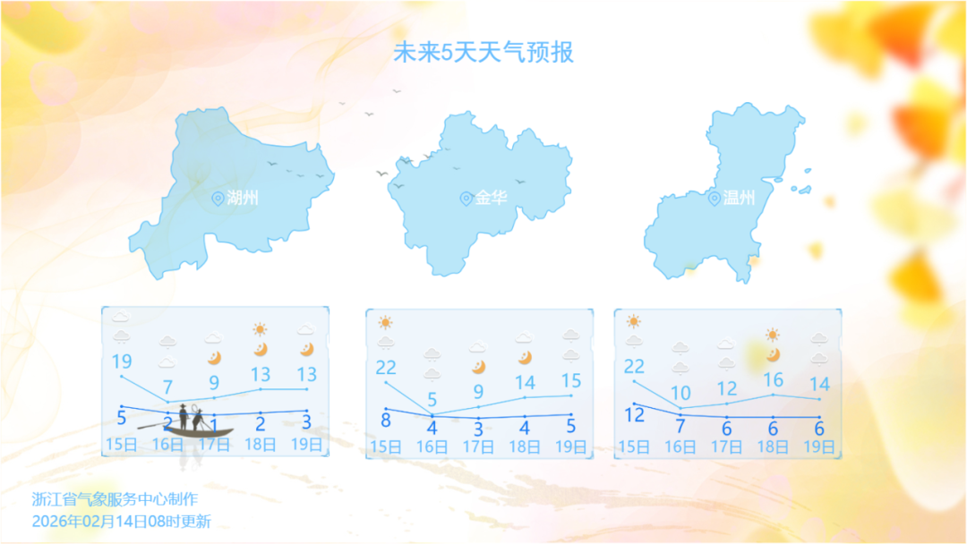 17日(大年初一)冷空气过后,浙江雨渐止转阴到多云。但17日-18日早晨,气温较低,全省大部为2℃~5℃,山区0℃左右。18日(大年初二)开始,气温逐日回升,到20日-21日白天,最高气温普遍回升至20℃以上。