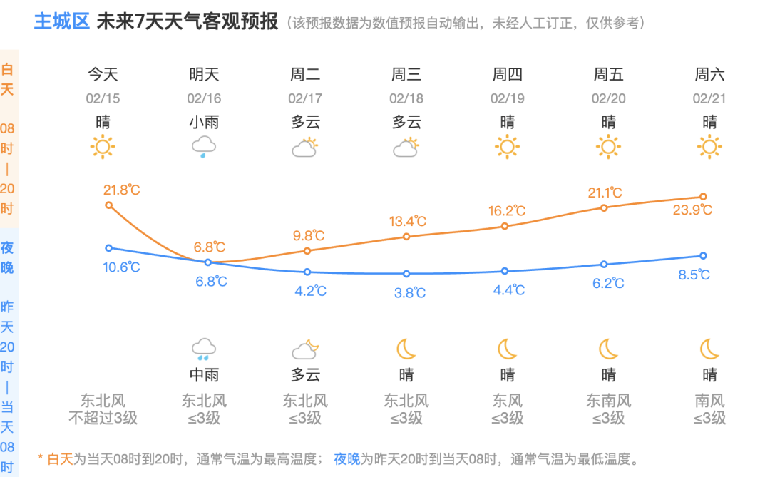 受冷空气影响,今天下午起气温逐渐下降。明天(除夕)白天的最高气温降至7℃,尤其需要注意17日-19日早晨主城区的最低气温很低,只有2℃~5℃,有霜。早晚出门还是要穿上厚外套,戴好帽子、围巾、手套,做好防寒保暖措施。