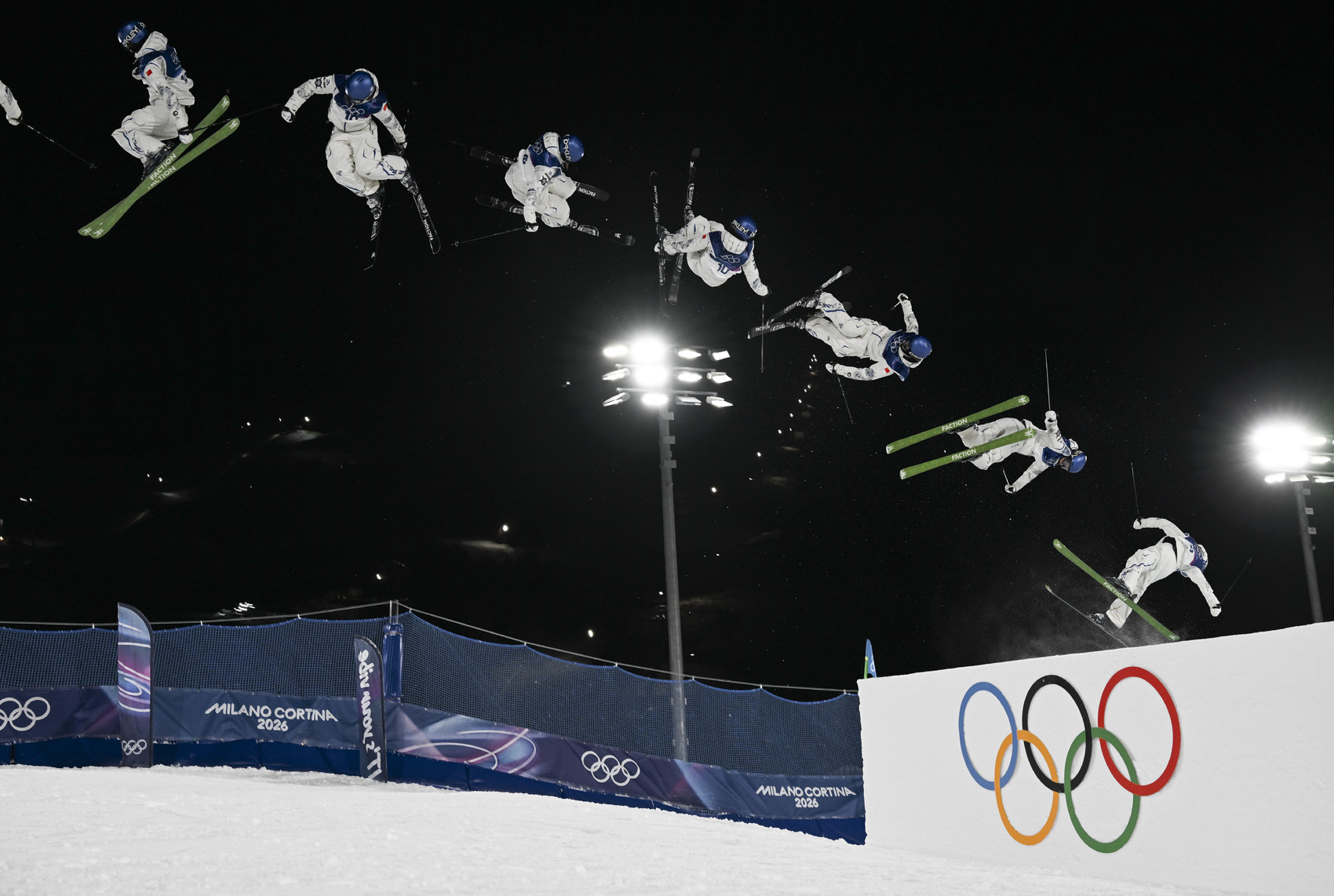 2月14日,中国选手谷爱凌在自由式滑雪女子大跳台资格赛中(多重曝光照片)。新华社记者 夏一方 摄