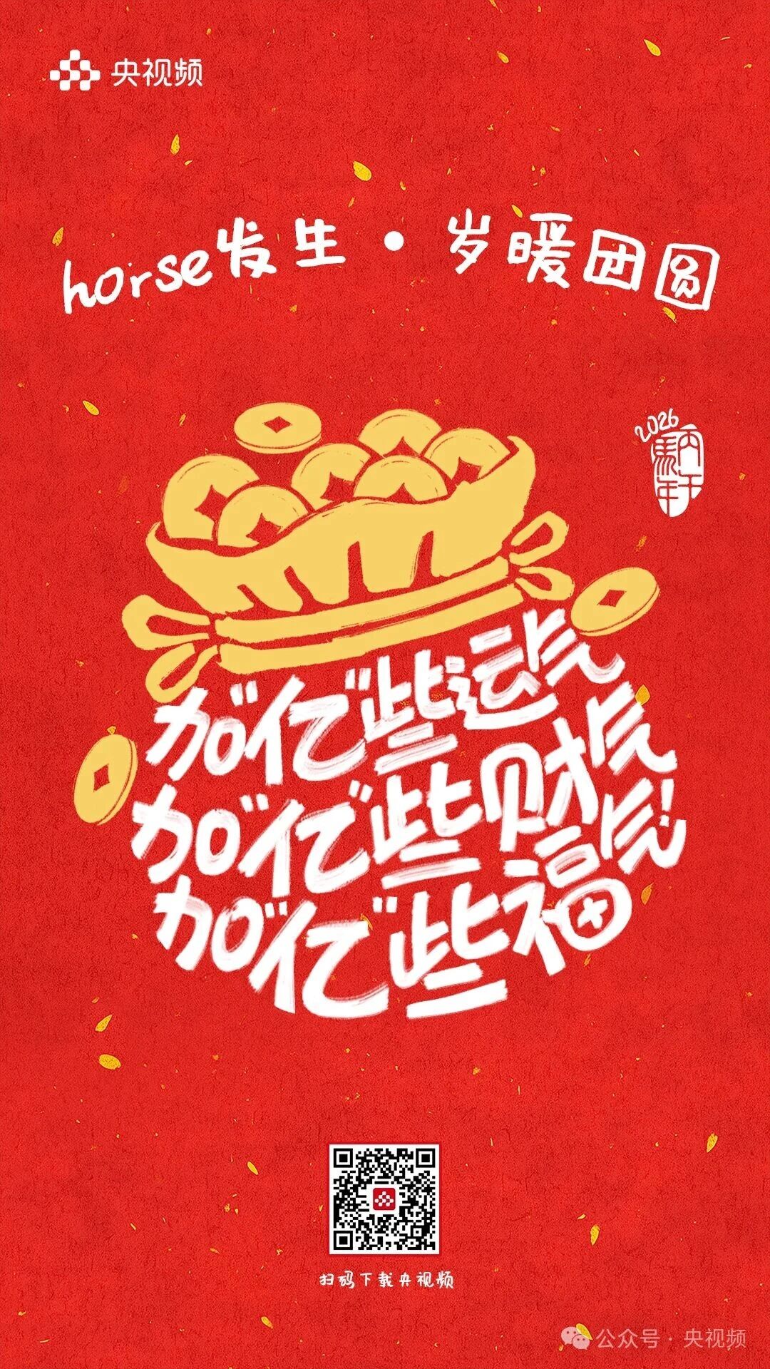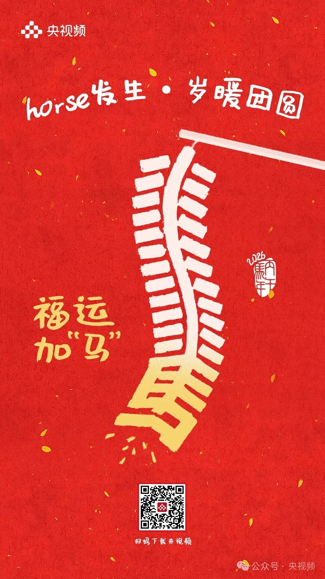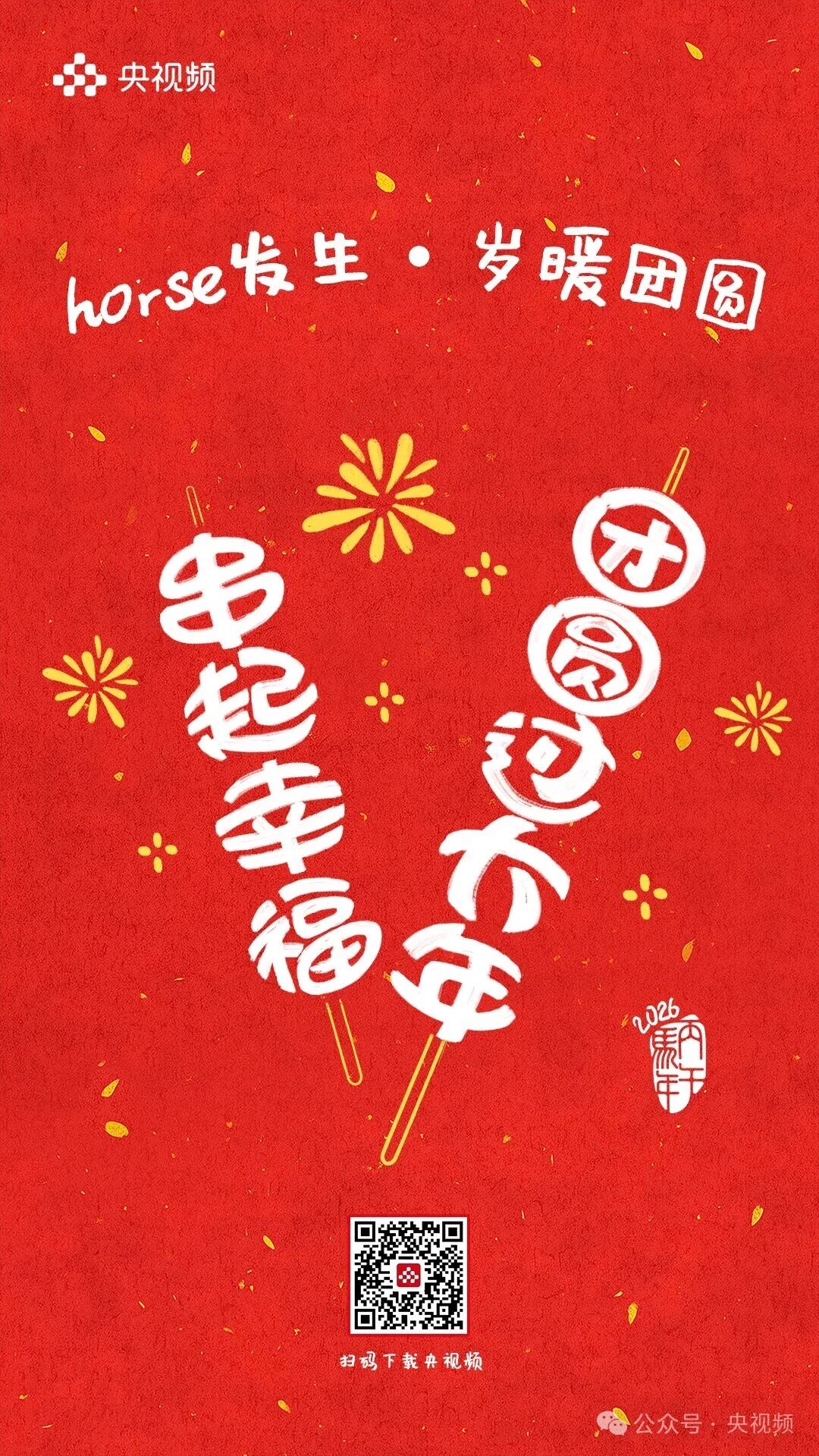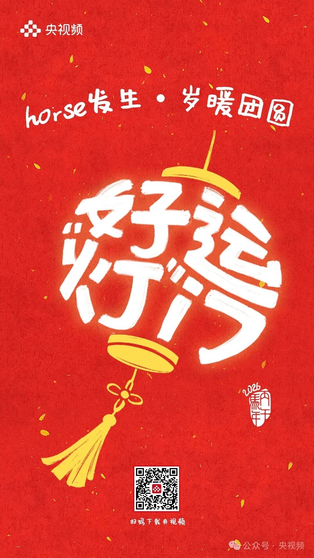 horse发生,岁暖团圆。 [爆竹][红包][福]……这些刻在DNA里的春节符号此刻都糅进了这9句祝福里 每一张海报都是一个关于团圆的微小叙事藏着我们对新年最朴素的期待 把岁暖团圆揣进心里把新年好运握在手中! 愿你福运加“马”,好运“灯”门2026,万事可期![爱心][爱心][爱心]