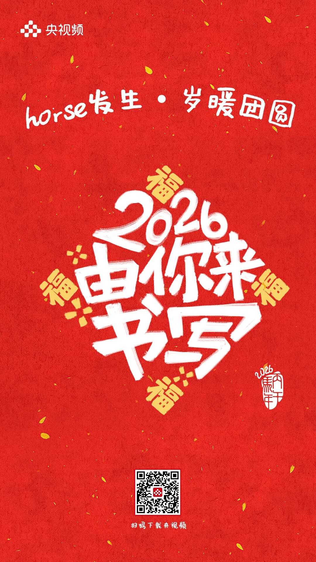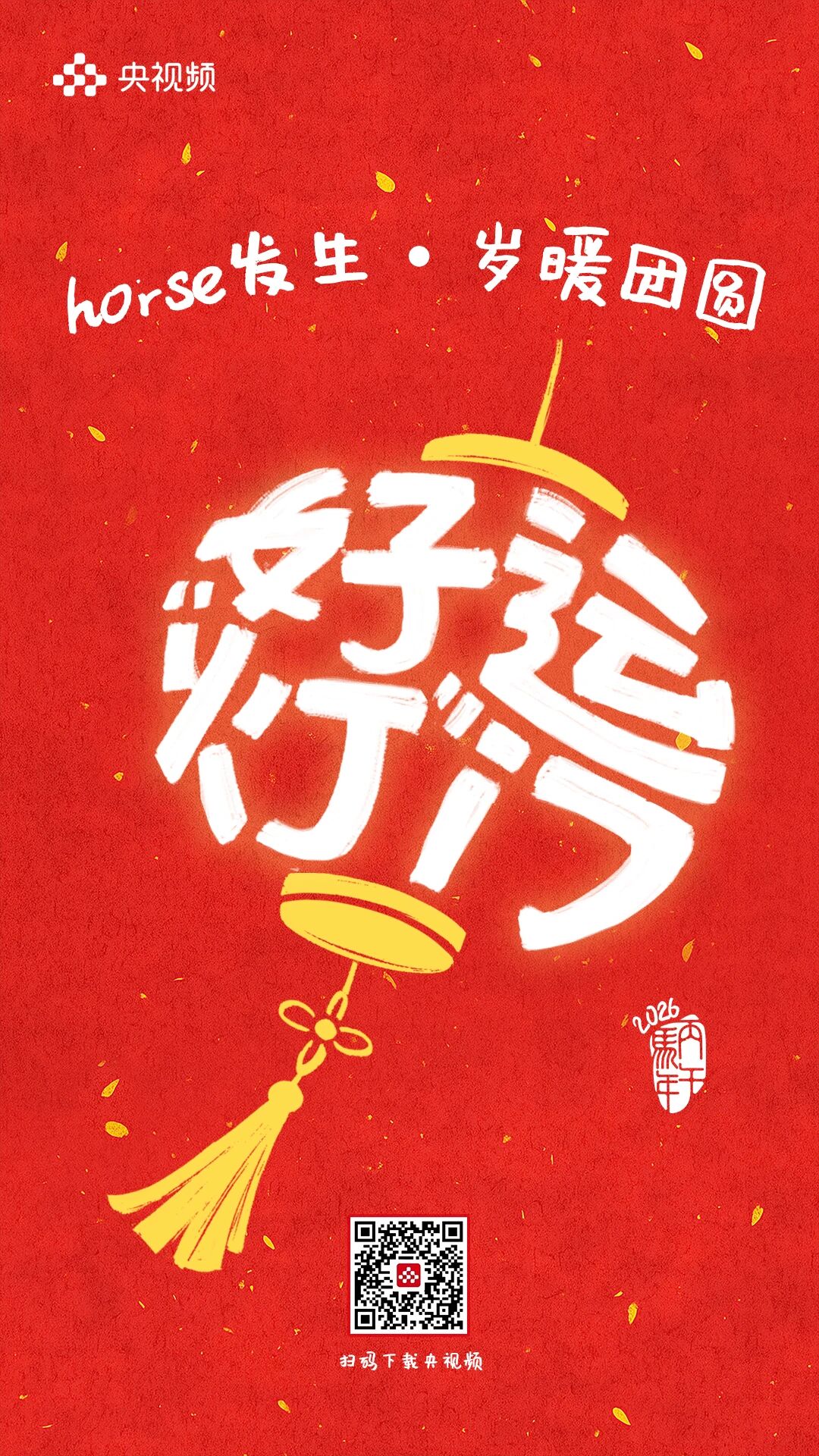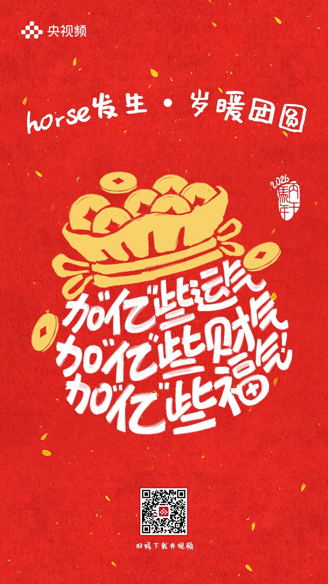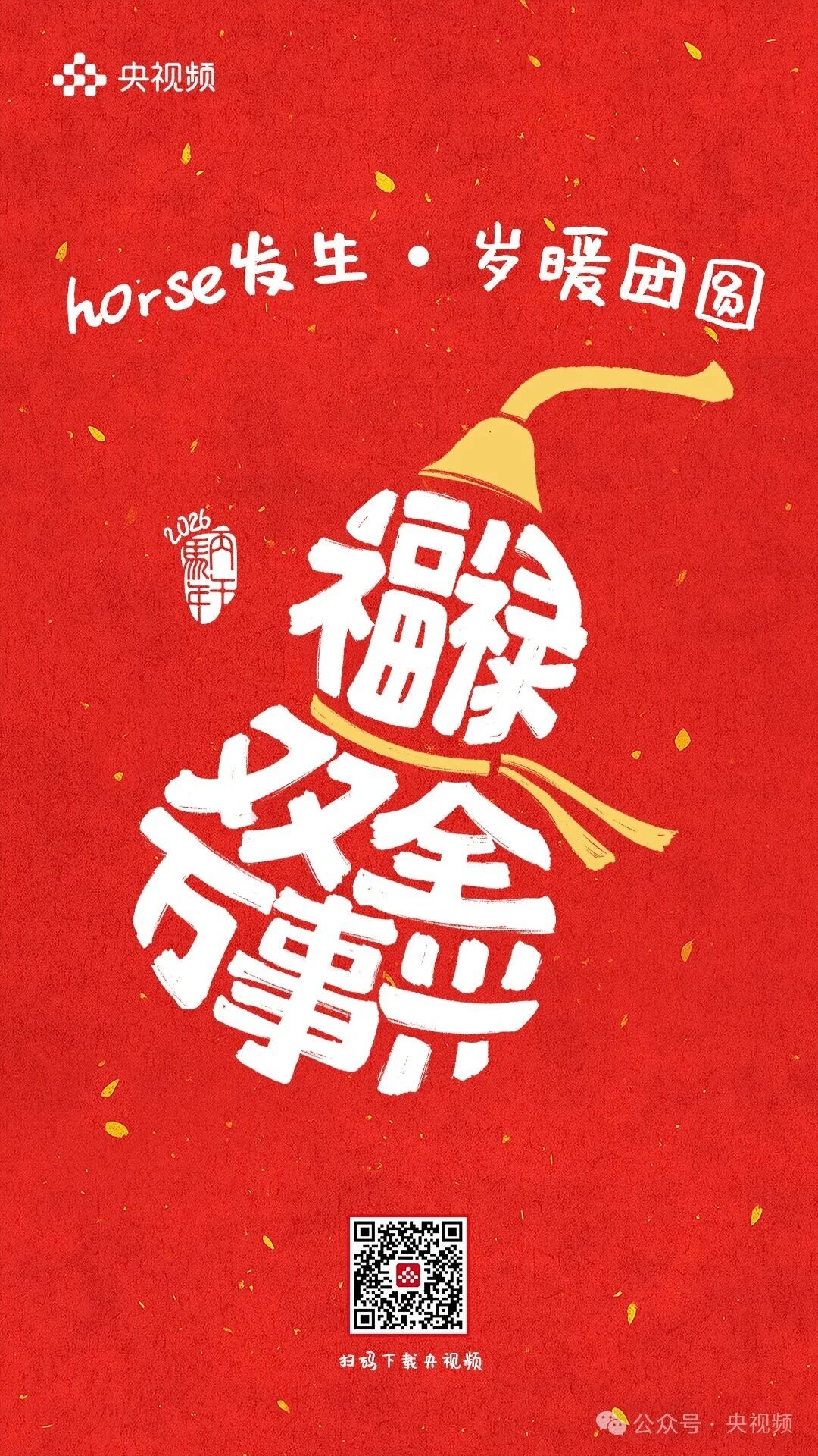 horse发生,岁暖团圆。 [爆竹][红包][福]……这些刻在DNA里的春节符号此刻都糅进了这9句祝福里 每一张海报都是一个关于团圆的微小叙事藏着我们对新年最朴素的期待 把岁暖团圆揣进心里把新年好运握在手中! 愿你福运加“马”,好运“灯”门2026,万事可期![爱心][爱心][爱心]