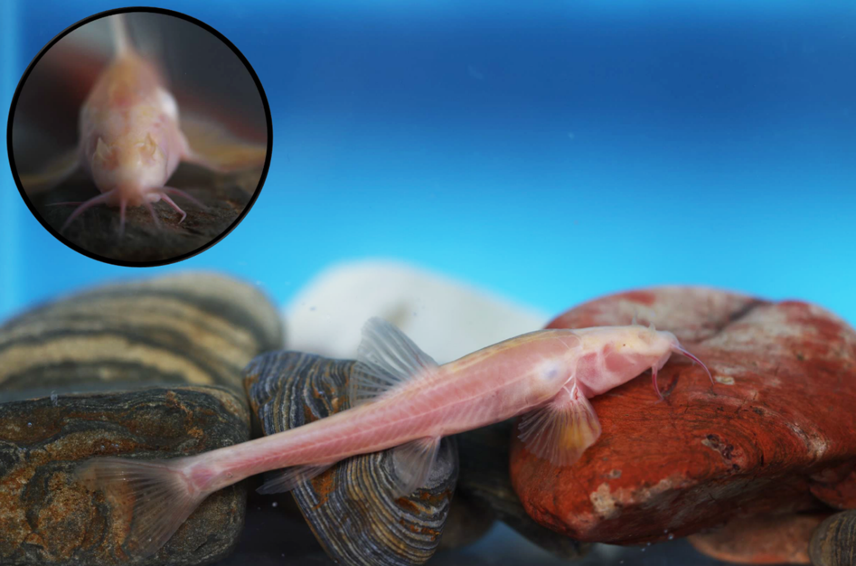“纳雍盲高原鳅”的活体图,其身体呈现透明淡粉色,鳞片消失,眼睛退化为小黑点。图据新华社(受访者供图)
