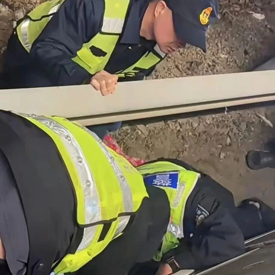 交警上前查看并尝试各种方式,都无法打开车门,又提醒驾驶人尝试引导小猫去踩车门解锁键。