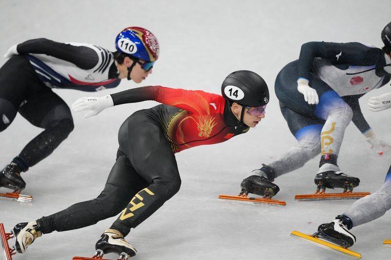 2月14日,中国短道速滑选手刘少昂(中)在比赛中(新华社)