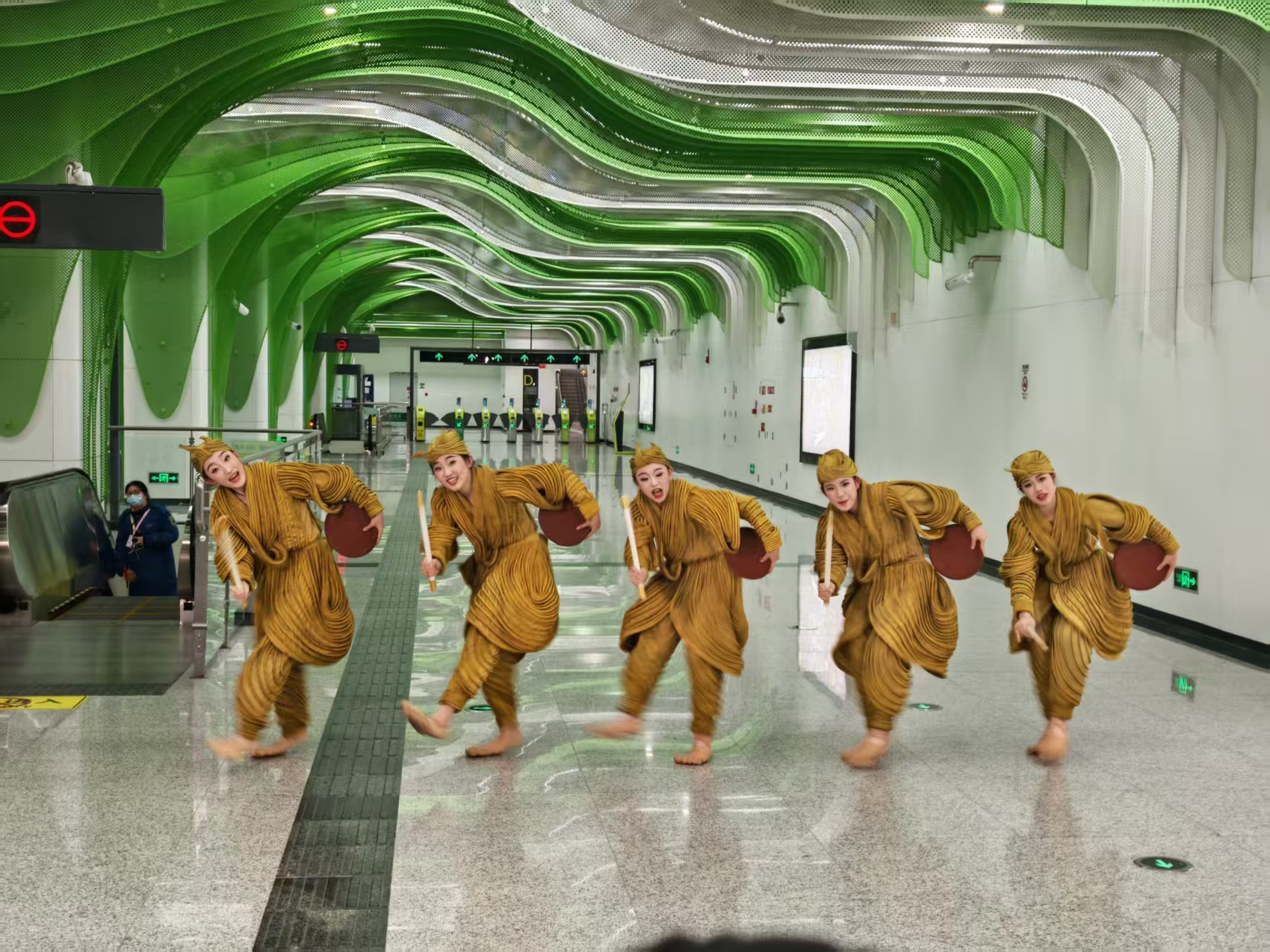 《俑跃锦官城》是一个舞蹈节目,它以四川出土的东汉击鼓说唱俑为创作蓝本,创新性地融合汉代说唱艺术与现代街舞元素。在这一节目中,盐中学子扮演的说唱俑在虚拟技术的赋能下,从崇州的幽静竹林击鼓而起,一路穿越都江堰的千年江声、唐宋街坊的繁华遗址、IFS熊猫的时尚天台、地铁隧道的流光溢彩,最后在茶香缭绕的戏台上,与烟火里的成都人民共舞。