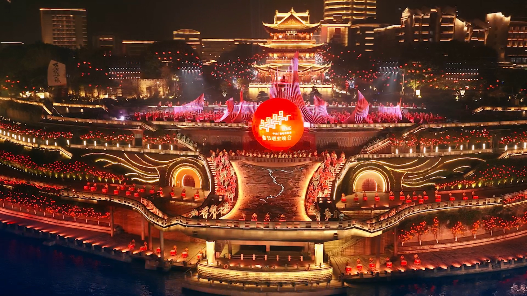 本次春晚,更是精心设计光影和舞台,使之与整个城市夜景融为一体,以城为景,山水联动。
