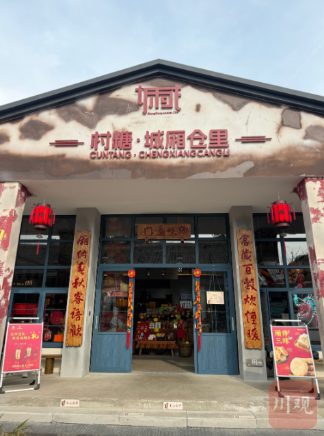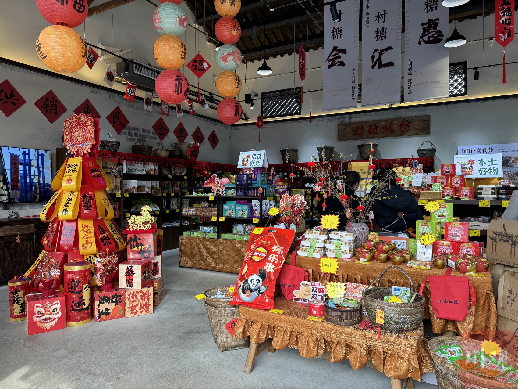 沿着主会场往西街走去,青石板街道人流如织。古城驿站里,坐满了歇脚的游客,晒太阳、喝茶、聊天、嗑瓜子,惬意又自在。在“村糖·城厢仓里”,水泥地面、老墙皮,货架上还挂着鸡鸭鱼鹅猪等腊货,俨然是上世纪80年代的供销社模样,复古又亲切。