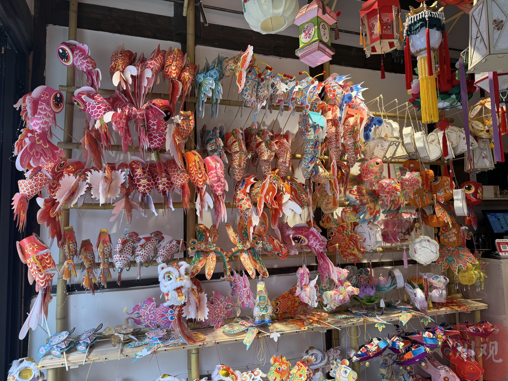 驿站出来往右走几步,是城厢花灯馆。一进门,满眼都是花花绿绿的花灯,龙头、凤凰、蝴蝶、蜻蜓等,挂得满满当当。还有从全国各地搜罗来的无骨花灯、彩灯、针刺灯,个个都是珍宝,工艺精湛、造型精美,不少游客举着手机拍照打卡。