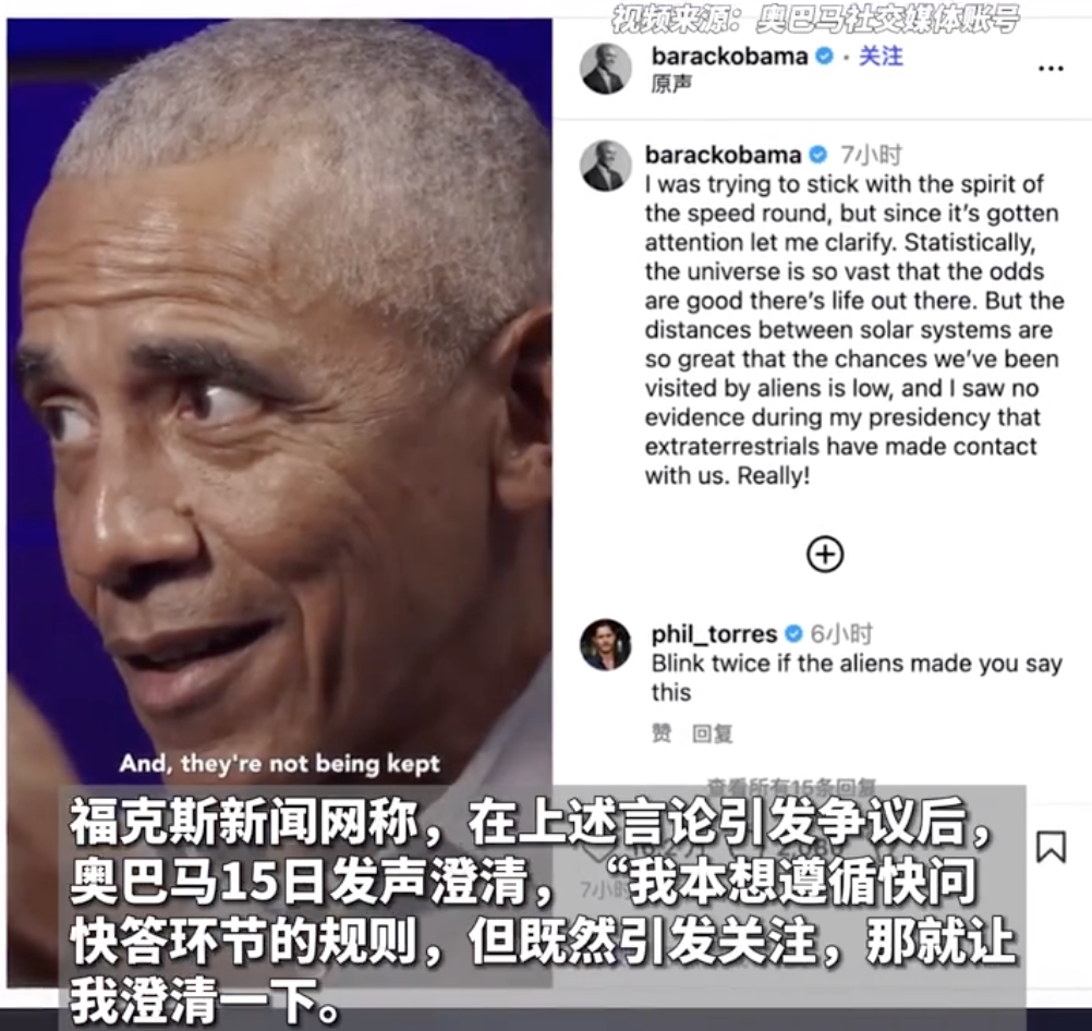 据美国福克斯新闻网报道,在“外星人确实存在”相关言论引发网民争议后,美国前总统奥巴马当地时间15日在社交平台Instagram上又发声澄清说,在他担任总统期间,并未见过与外星生命接触的证据。