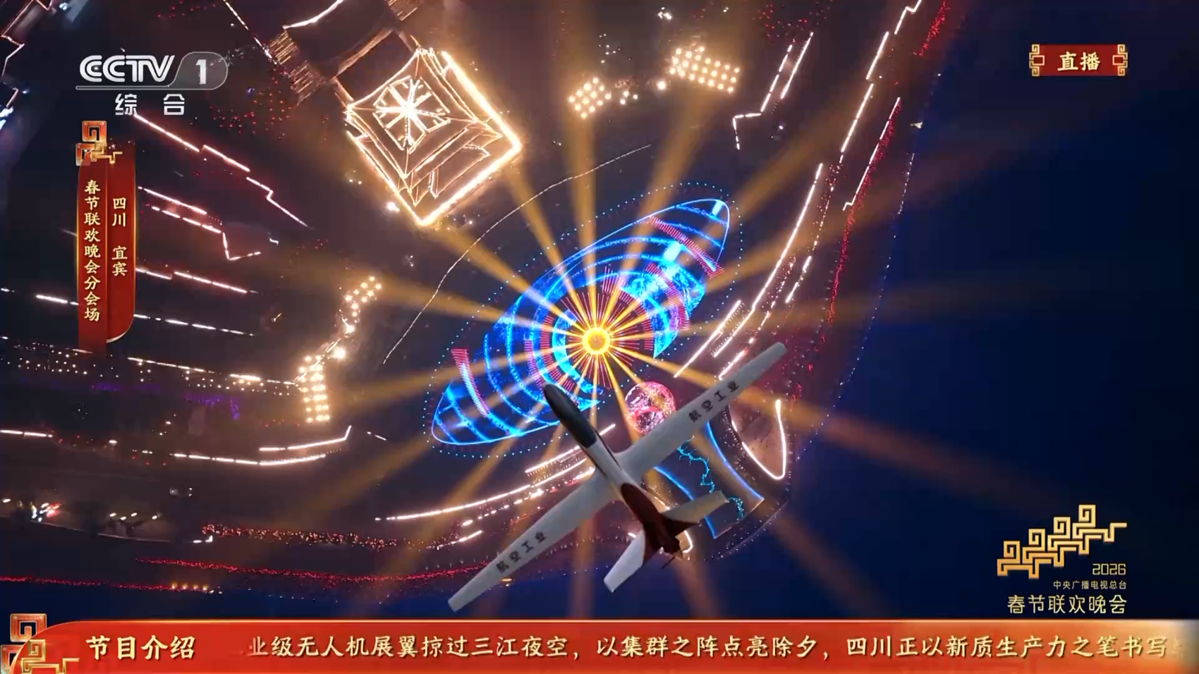 在中央广播电视总台《2026年春节联欢晚会》宜宾分会场《立上游》节目中,12架“四川造”无人机“身穿”新春涂装腾空而起,飞越金沙江、岷江、长江三江交汇处,在夜空中向全国人民“拜年”,送上来自云端的新春祝福。这是中大型无人机首次集群式亮相总台春晚,以光影编织视觉盛宴,用科技彰显硬核实力,展现出自主创新的“四川智慧”。