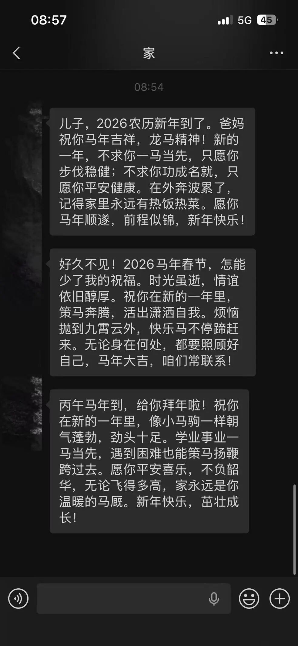 “儿子,2026农历新年到了。爸妈祝你马年吉祥,龙马精神!新的一年,不求你一马当先,只愿你步伐稳健;不求你功成名就,只愿你平安健康。在外奔波累了,记得家里永远有热饭热菜。愿你马年顺遂,前程似锦,新年快乐!”