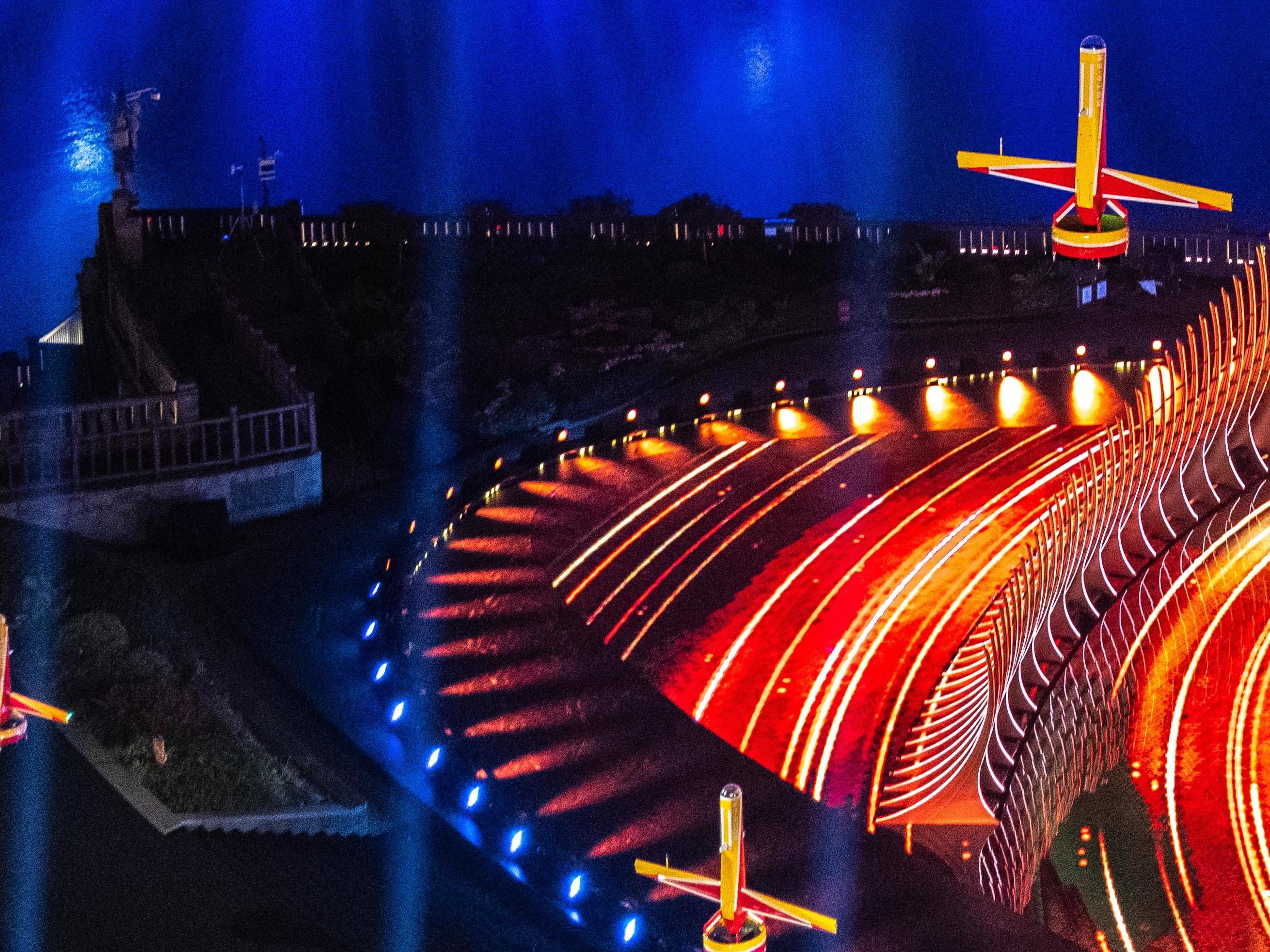 天色渐暗,长江之畔亮起了绚烂的舞台灯光,映照着每一位保障队员。