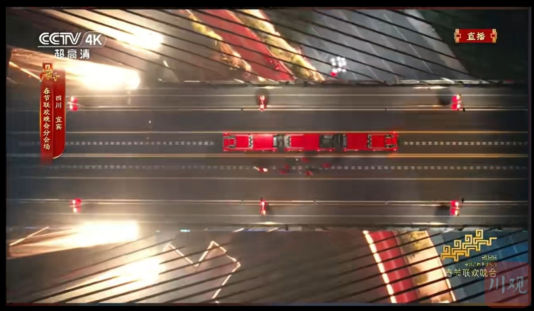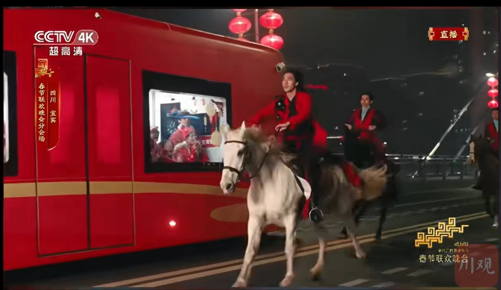2月16日晚,在总台春晚宜宾分会场开场环节,当演员此沙策马奔腾至宜宾长江大桥时,一辆车身印有“长江首城 宜人宜宾”金色字样的红色智轨穿梭而过,与两岸璀璨灯火交相辉映。此沙骑马与智轨相遇,小演员亲切地招呼一声“过年好!”,一场跨越时空的“古今对话”在这里演绎。