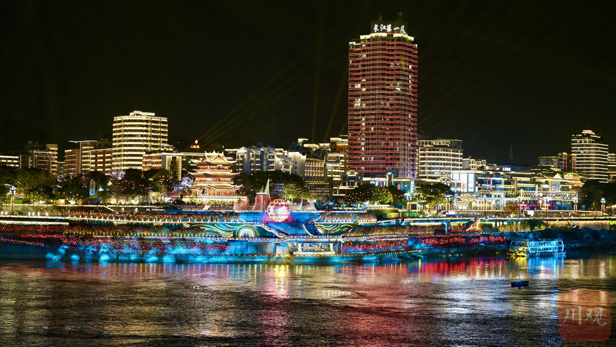 夜幕降临,华灯初上,宜宾城区已是人潮涌动。记者在三江交汇之处三江口看到,对岸的“长江之珠”在缤纷的灯光勾勒下呈现出斑斓色彩,不远处,白塔山和七星山的山体灯光秀流光溢彩,将整座城市的夜空渲染成了流动的画卷。