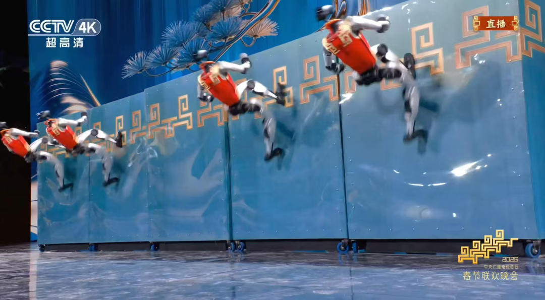 相较于去年春晚的《秧BOT》,本次节目中,宇树的人形机器人展现出前所未有的运动性能,实现了多项全球首次技术突破:实现全球第一次连续花式翻桌跑酷;全球第一次弹射空翻、空翻最大高度超3米;全球第一次单脚连续空翻、两步蹬墙后空翻;全球第一次Airflare大回旋七周半等高难度动作。