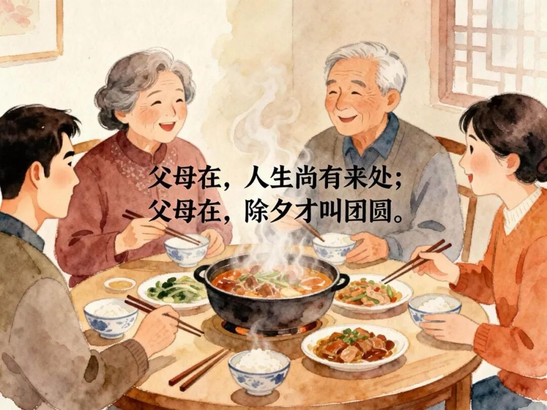 年夜饭的餐桌,那双手添菜的动作和二十年前一模一样,只是白发悄悄爬满了鬓角。我们慢慢懂了——父母在,人生尚有来处;父母在,除夕才叫团圆。