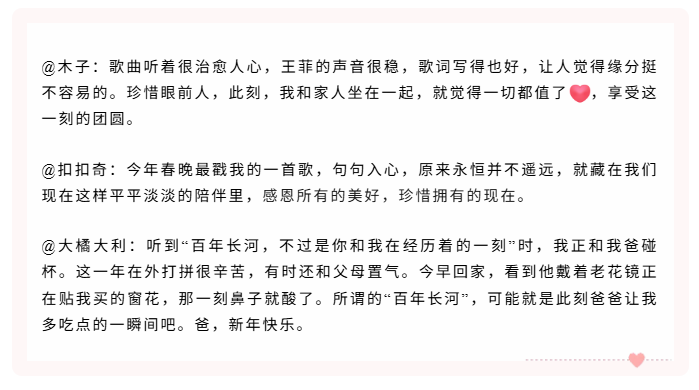 有网友说,从这首歌曲里听到“所有的相遇相知都是礼物,平凡的相伴,就是最大的永恒。”