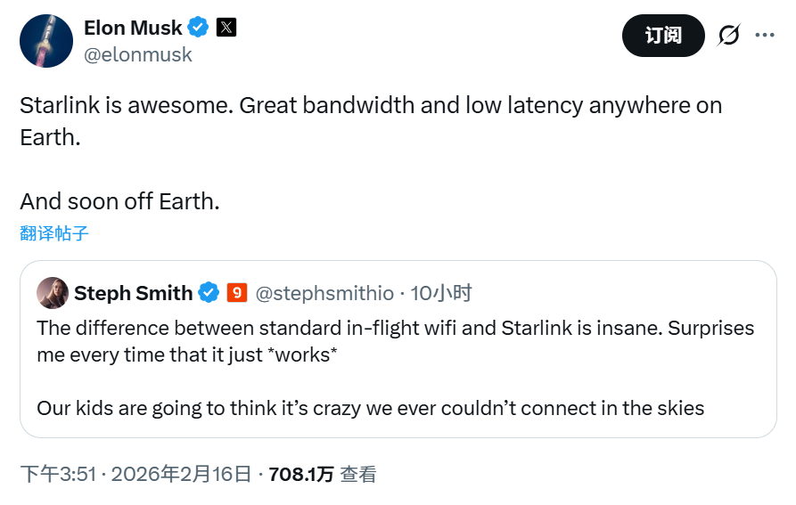 马斯克2月16日在社交媒体平台X表示:“星链太棒了,无论在地球何处,都能提供超高带宽和超低延迟,而且很快就能在地球之外服务了。”