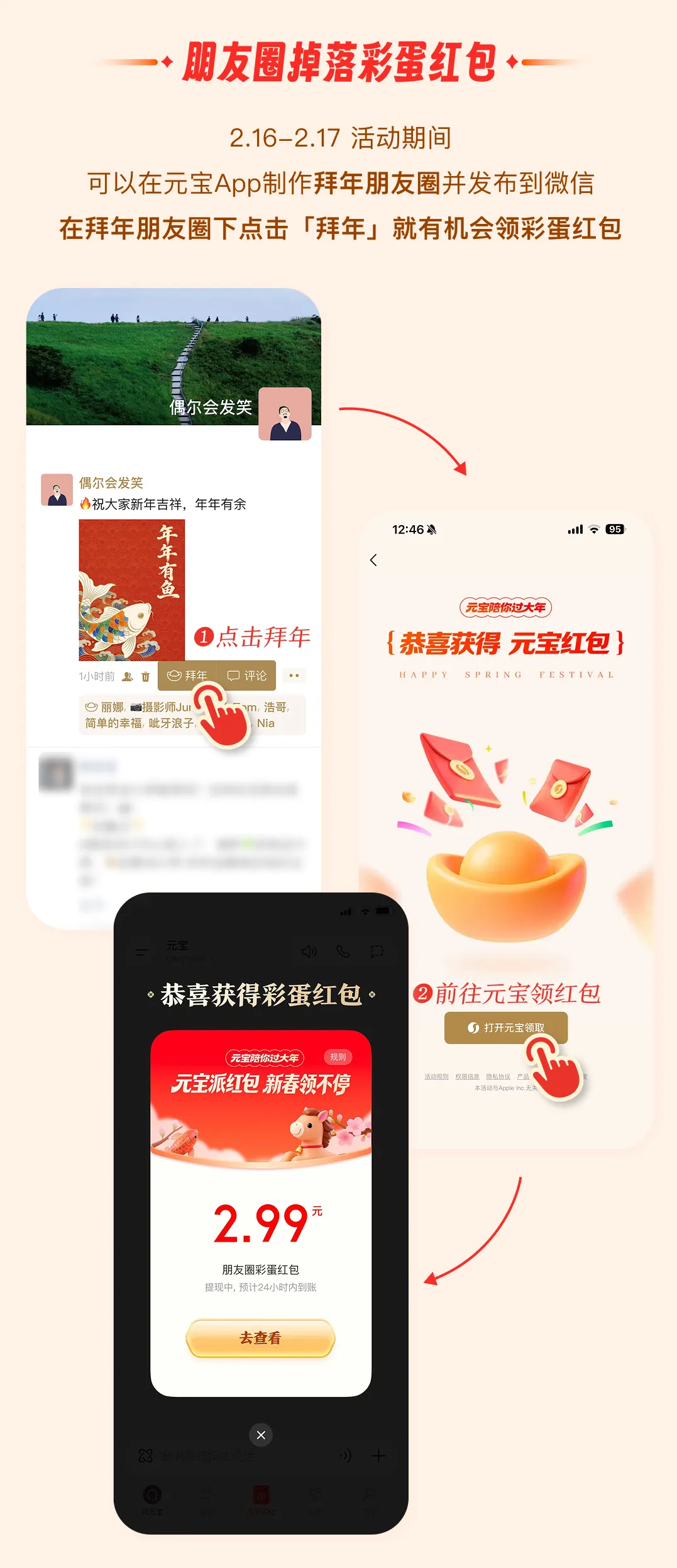 很多人问,金色朋友圈怎么弄。操作指引来了,现在元宝里制作“拜年朋友圈”并发表,这样就可以触发。给别人的金色朋友圈点赞,还有机会掉落红包。