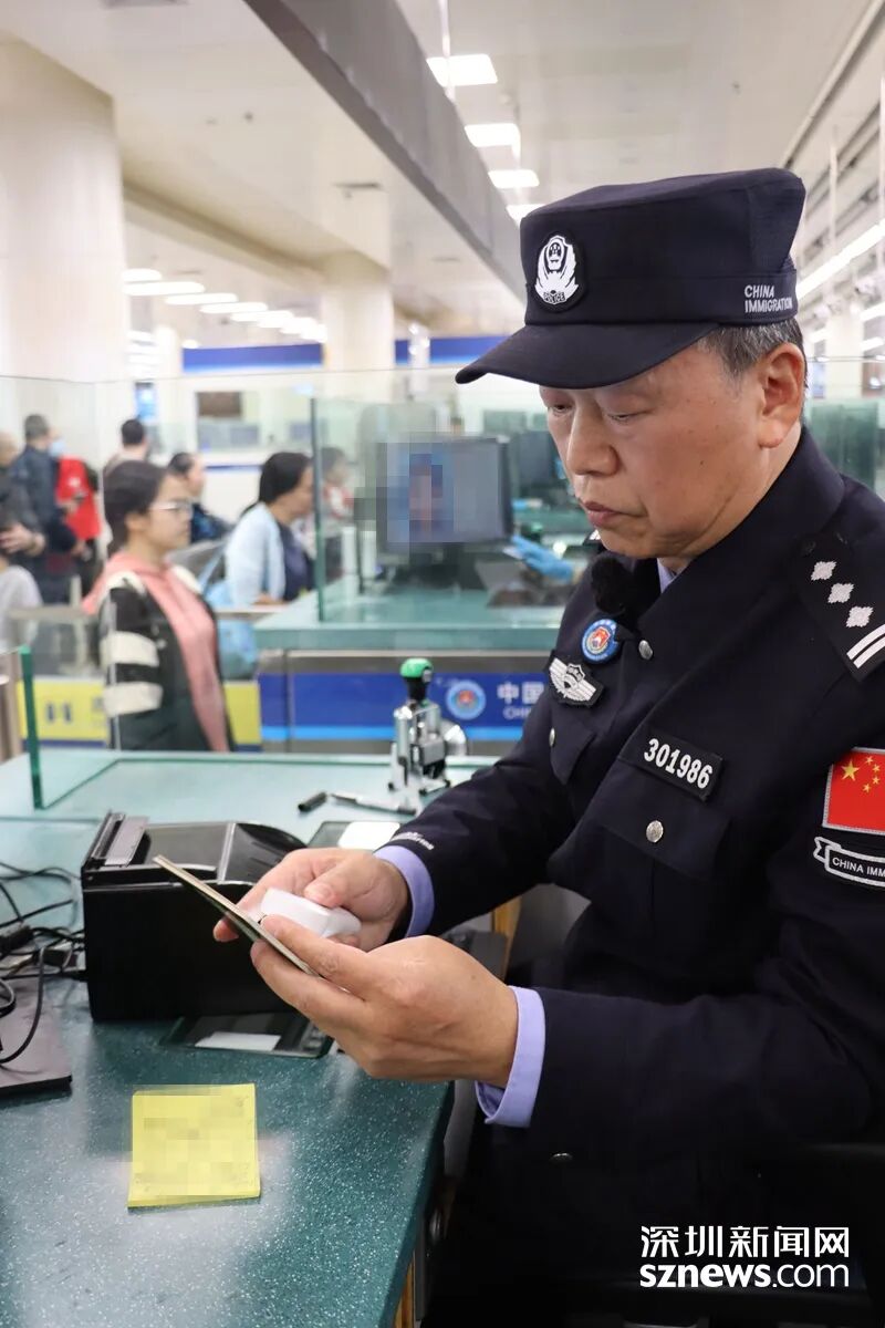 验证台上,龙仕新以熟练的动作、温和的笑容,为络绎不绝、归心似箭的旅客办理出境查验手续。今年的春节可能是他41年从警生涯最后一个值守国门的春节。