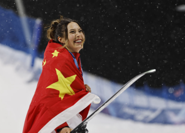 谷爱凌在颁奖仪式后身披国旗庆祝。图据新华社