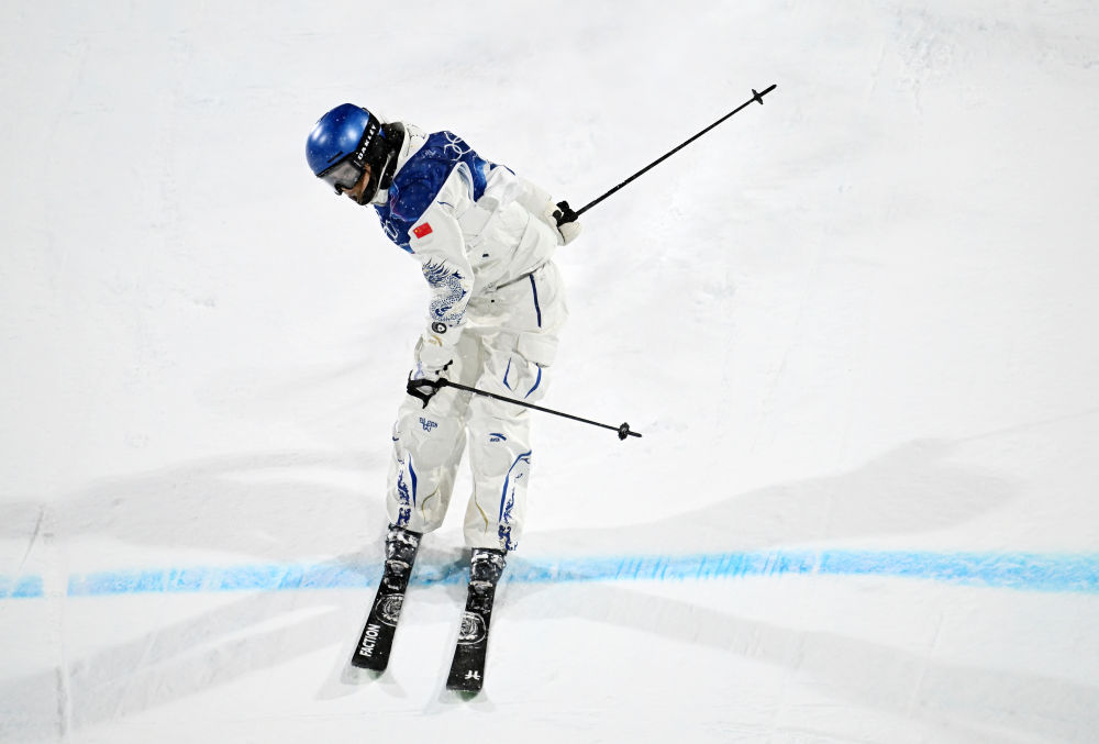 ↑谷爱凌在第一轮比赛中落地。