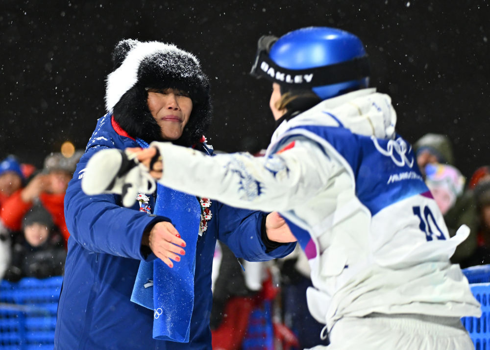 ↑谷爱凌(右)在第三轮比赛后与母亲相拥庆祝。