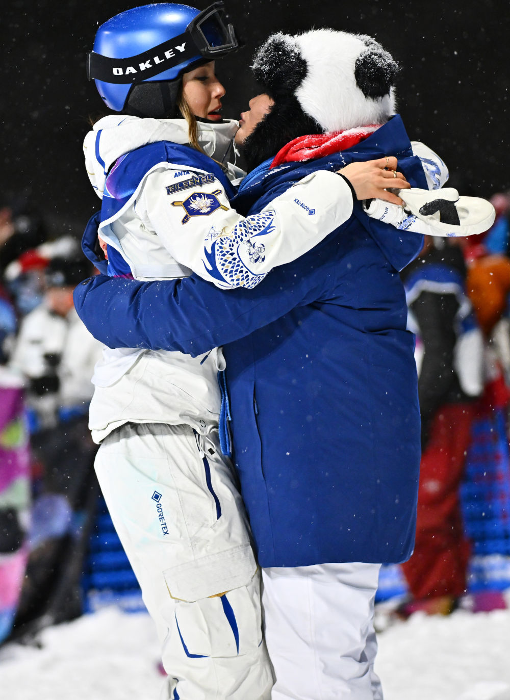 ↑亚军谷爱凌(左)赛后与冠军梅甘·奥尔德姆拥抱庆祝。