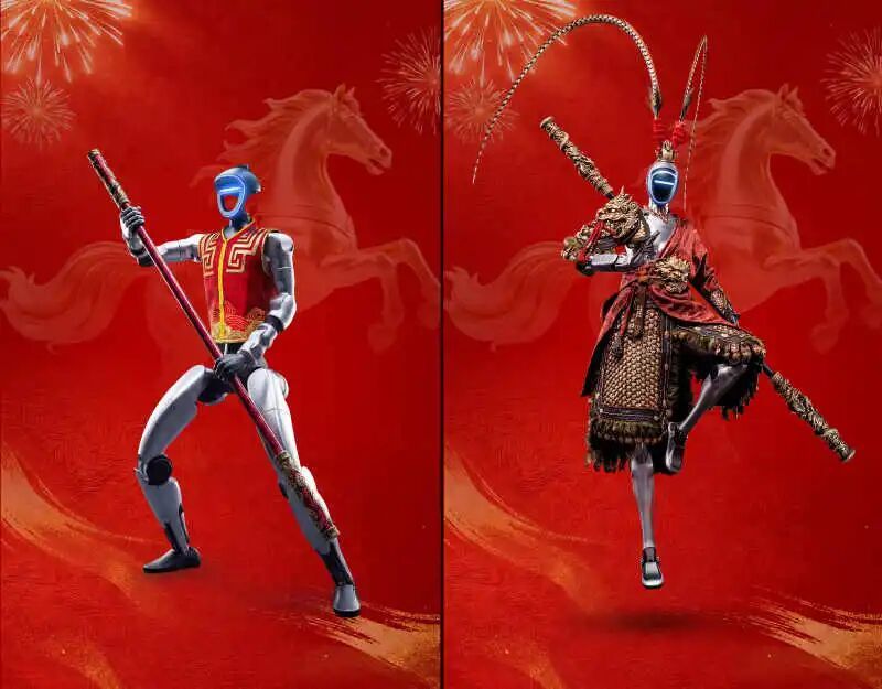 与此同时,千里之外的义乌分会场上演着另一番景象。H2人形机器人则身披大圣重甲、手持金箍棒,脚踏由B2W机器狗扮演的“筋斗云”穿梭于街巷之间,最终从天而降,落于巨蛋剧场。