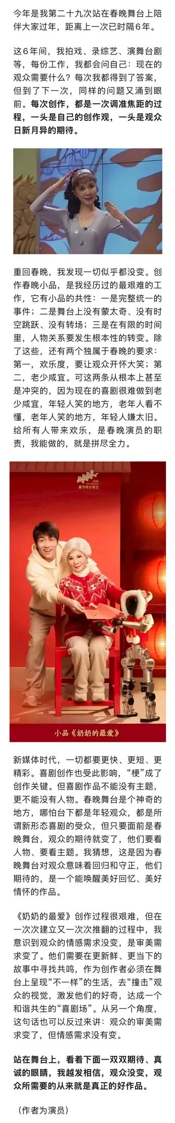 《人民日报》2月17日大年初一刊发演员蔡明署名文章《笑声里有好作品的答案》。