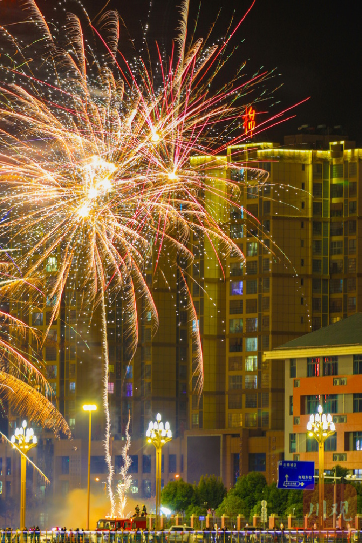 烟花光闪耀天空,声音震天惊四方,牛味浓烈中国红。